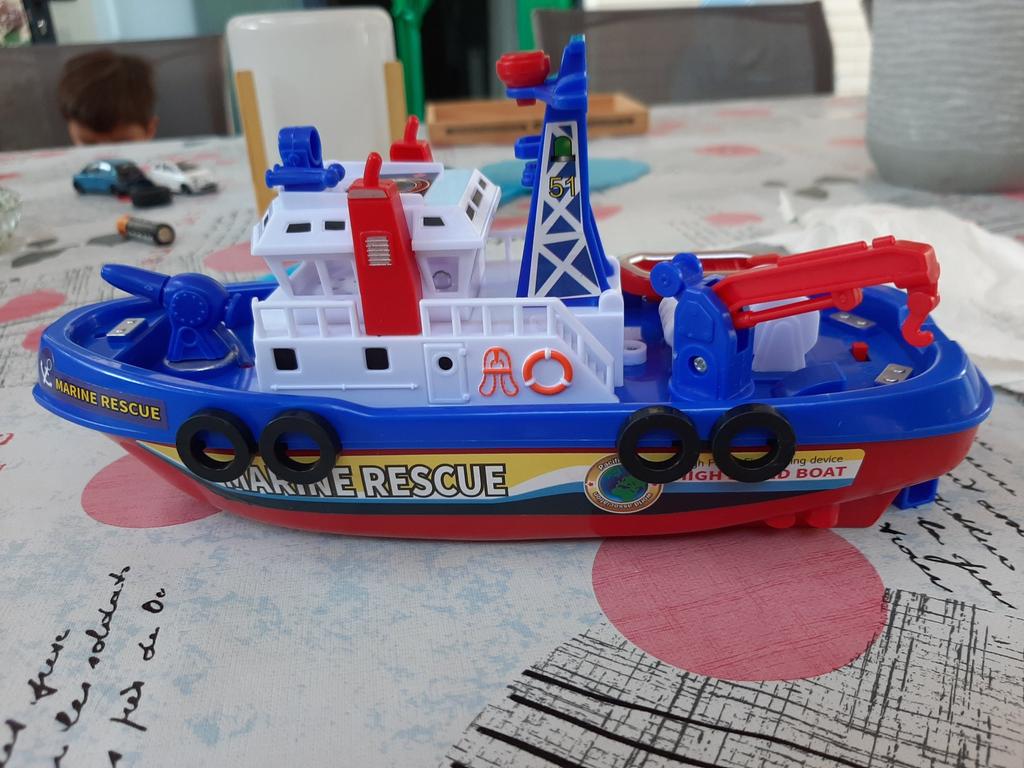 Juguete educativo modelo de barco de bomberos de rescate marino eléctrico con rociador de agua y música para niños