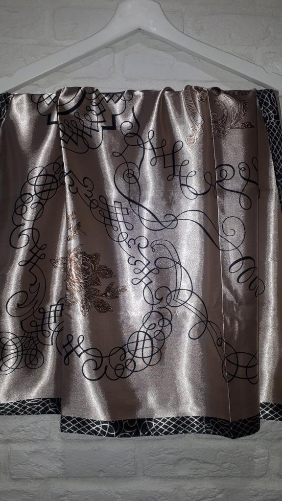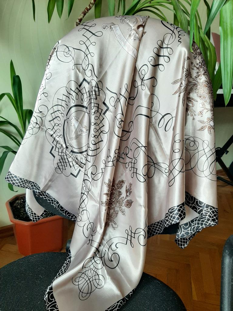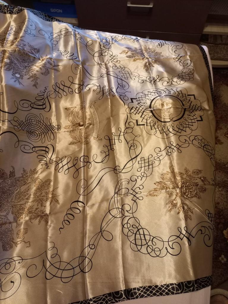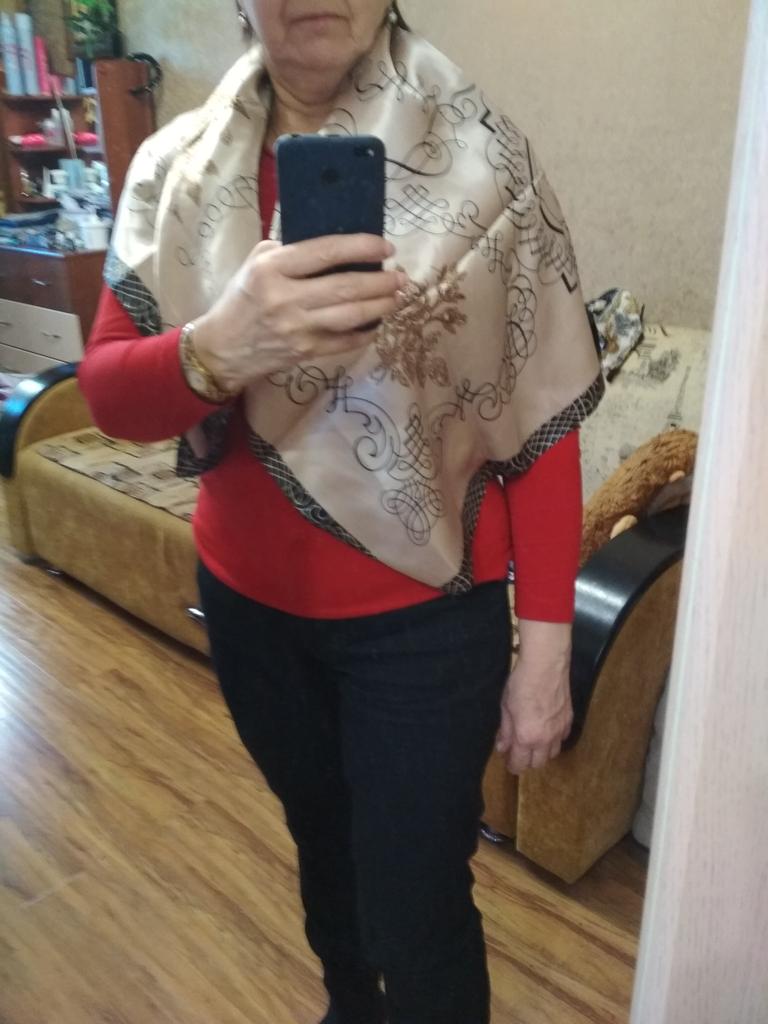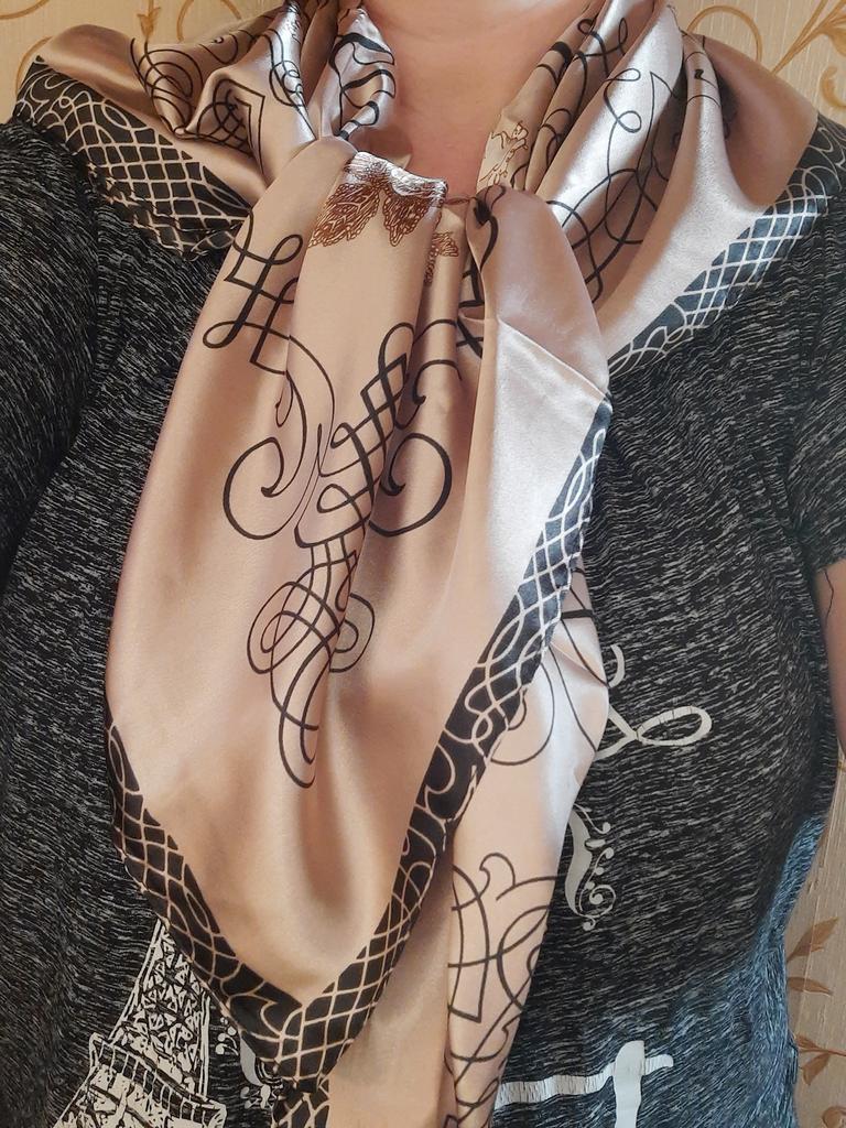 Precioso pañuelo, cuadrado, de 86 cm de diámetro, no de seda, pero de un bonito color con brillo. Para la primavera, justo lo que necesitas. Gracias, Jum. Yo recomiendo.