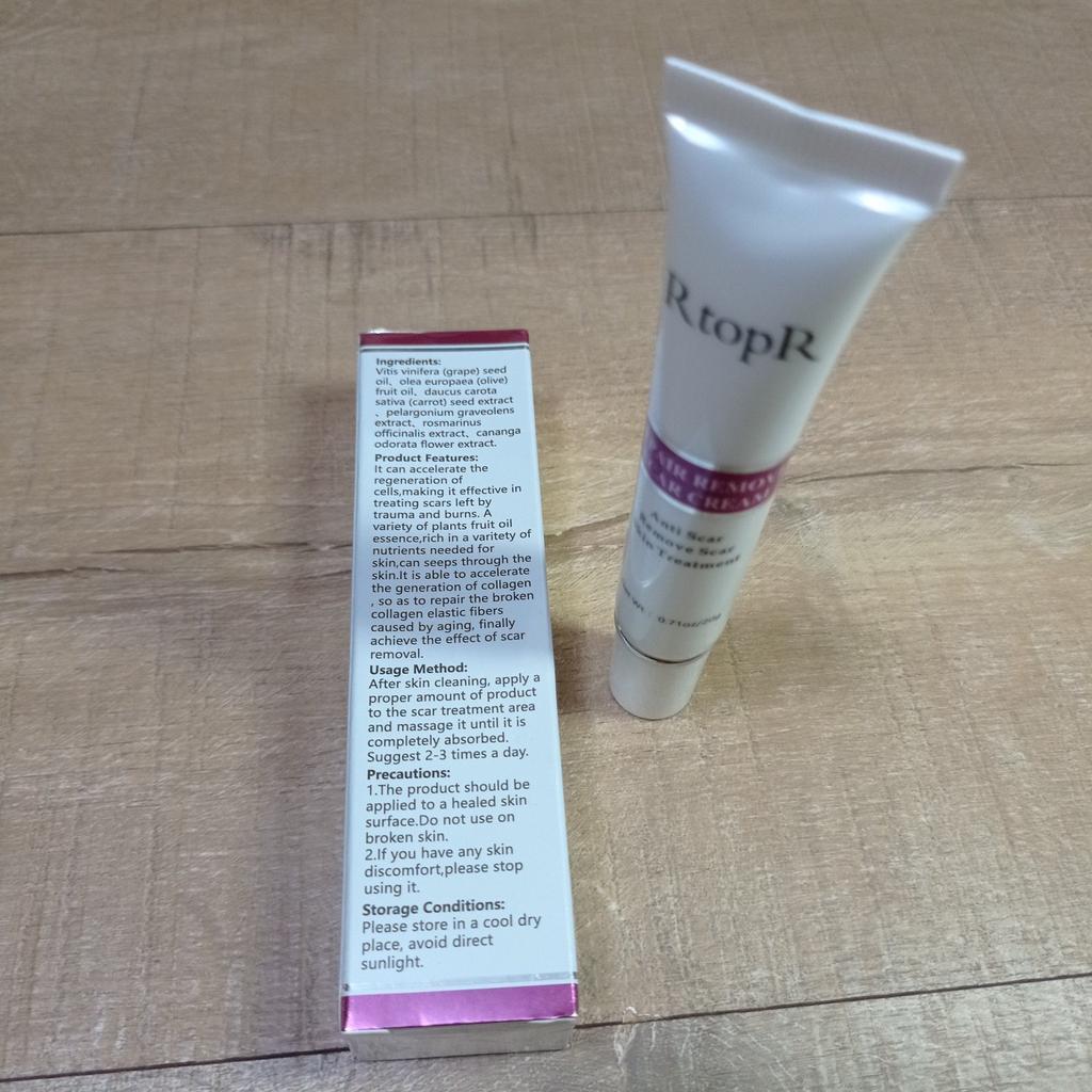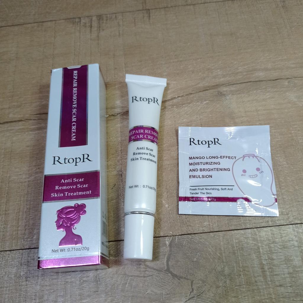 🌺 Crema cicatrizante 🌺 Lo pedí para cicatrices de acné. Odio cuando el acné desaparece pero deja su cicatriz durante meses. Estoy buscando un buen producto para desvanecerlos. En realidad pedí muchos de otras marcas. ODEO, MeiYanQoing, Mabrem y este RtopR. Quiero comprobar su velocidad de curación y hacer una comparación. Me gusta esta marca, especialmente me gusta su textura y olor a crema de mango.. 🌺 Esta crema es para todo tipo de cicatrices, como cicatrices de operaciones, cicatrices traumáticas, quemaduras, cicatrices de acné. 🌺 Esta crema pretende acelerar la regeneración de las células de la piel. Creo que definitivamente vale la pena intentarlo.. La cantidad total es de 20gr.