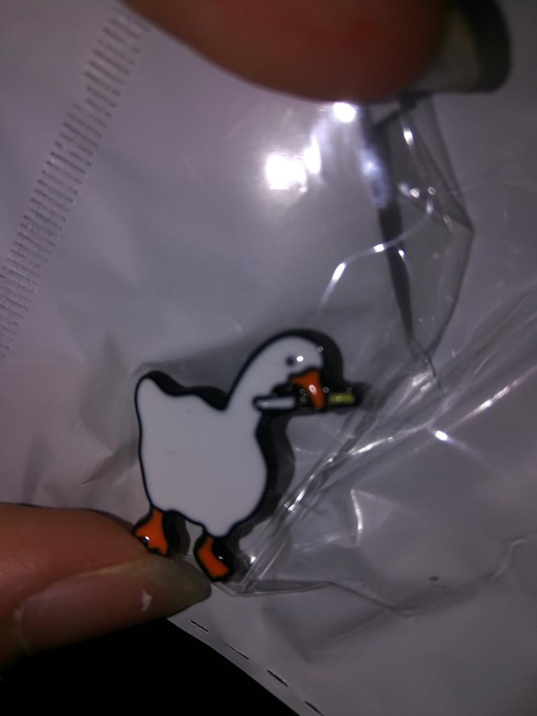 El pin vino doblado y el botón está deformado. El sobre en el que venía tenía marcas de quemado. Puede ser que el pin se deformara por altas temperaturas, pero ha quedado inservible y feo