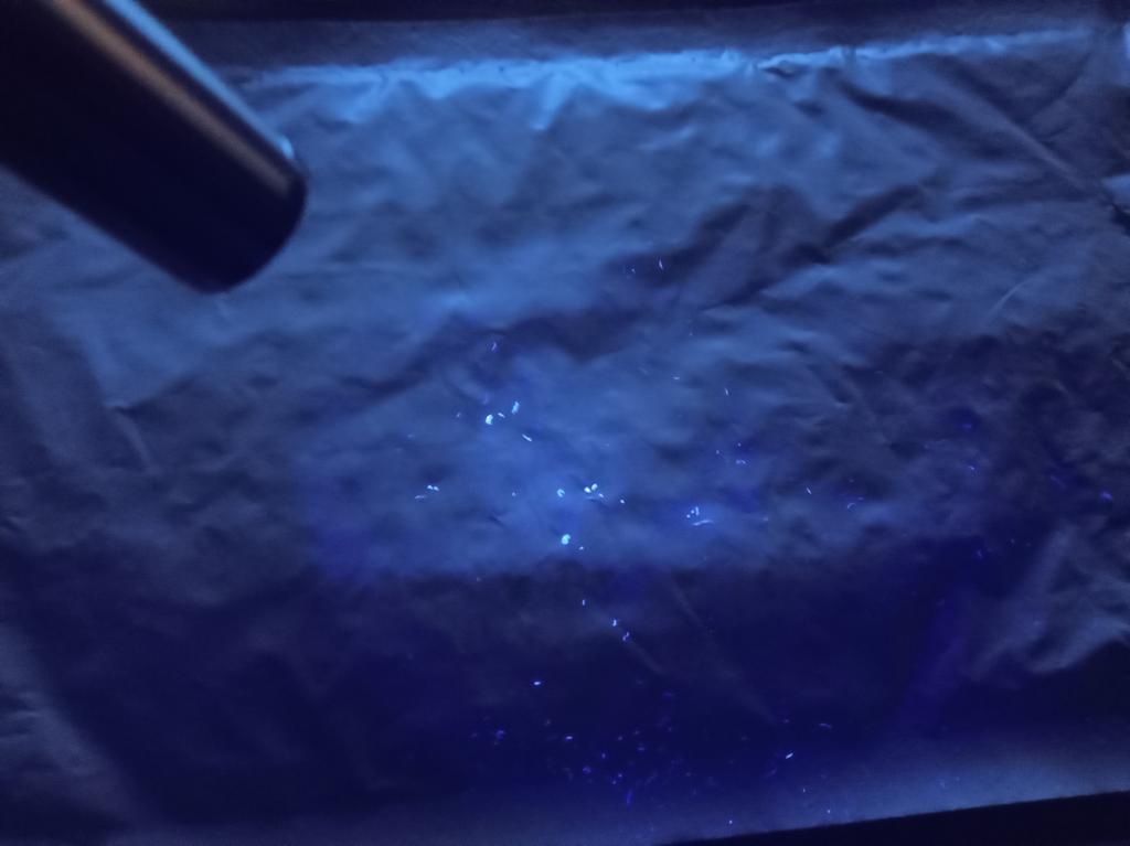 Funciona, pero lo que ve es desconocido. Algunas manchas son visibles en la lana, pero la oreja está limpia. También tengo marcas en mis manos. Parece una lámpara que detecta ambientes biológicos.