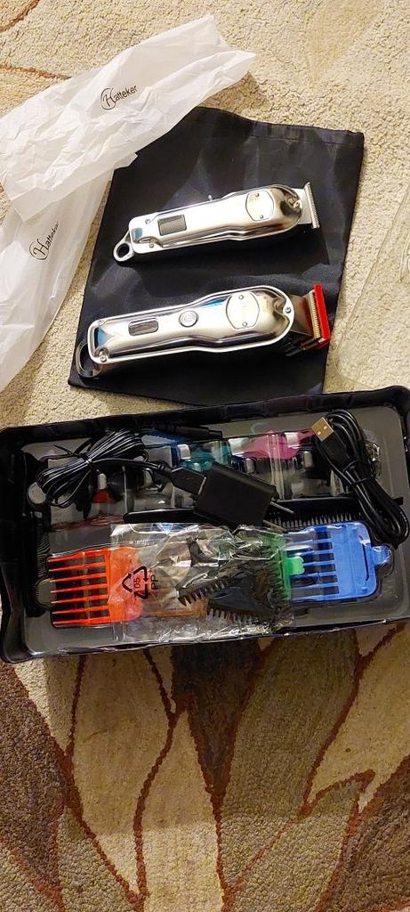 Set de 2 artículos Hatteker: una máquina para cortar cabello profesional y una recortadora con indicador LCD, 14 peines guía. 👆 ¡Qué oferta más interesante! ¡Recibirá dos excelentes máquinas para cortar cabello por este precio! Es ideal para peluqueros y para hacer cortes de cabello geniales en casa. Se puede utilizar la máquina grande para cortar el cabello y la pequeña para arreglar la barba. 👍 Ventajas: – El set incluye 2 máquinas. Para ser más precisos, una máquina para cortar cabello y una recortadora. La máquina para cortar cabello incluye 10 peines guía y la recortadora, 4. – Además, se incluye una capa, un cepillo para limpiar las cuchillas y dos peines. Puede utilizar un peine para el cabello y otro para la barba. Todo está muy bien pensado. – Los dos dispositivos son inalámbricos. La máquina para cortar cabello funciona durante 5 horas sin necesidad de recargarla, y la recortadora durante 3 horas. Ambos dispositivos se cargan con un cable UBS, también incluido en el set. – Los dispositivos disponen de un indicador LCD donde se puede ver la carga restante. 🤔 Desventajas: – El set no incluye una bolsa para guardar los peines guía.