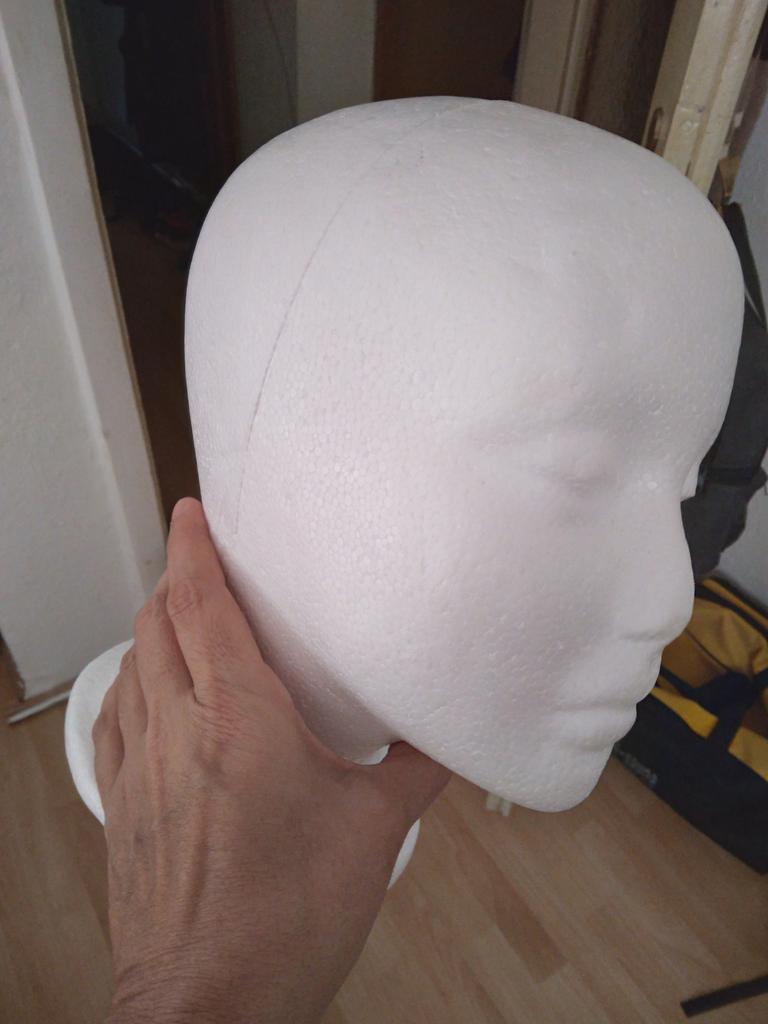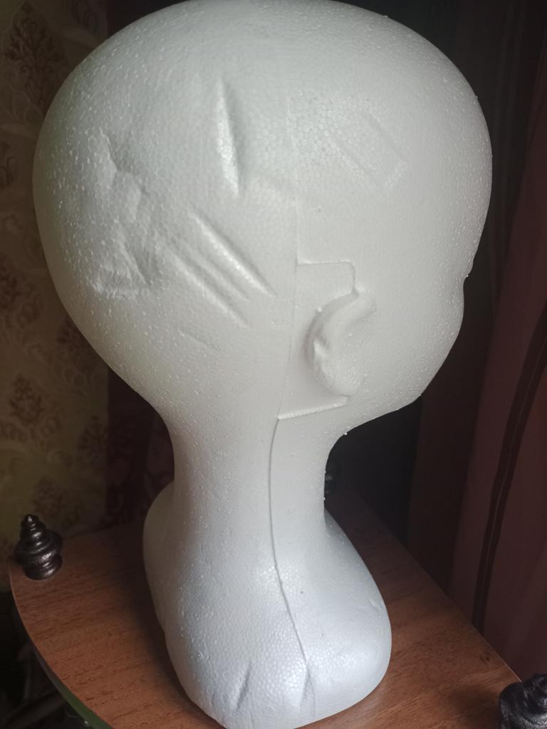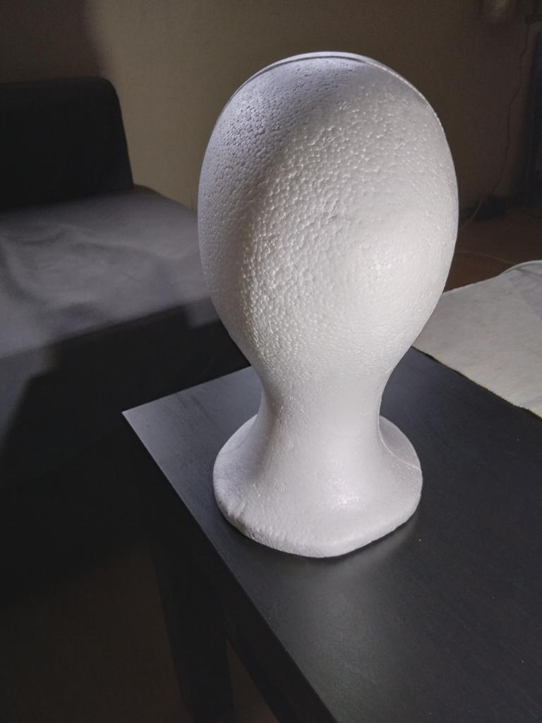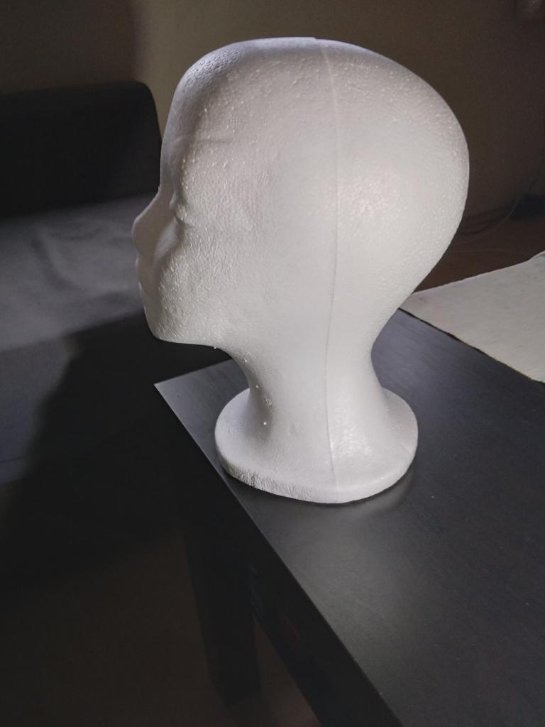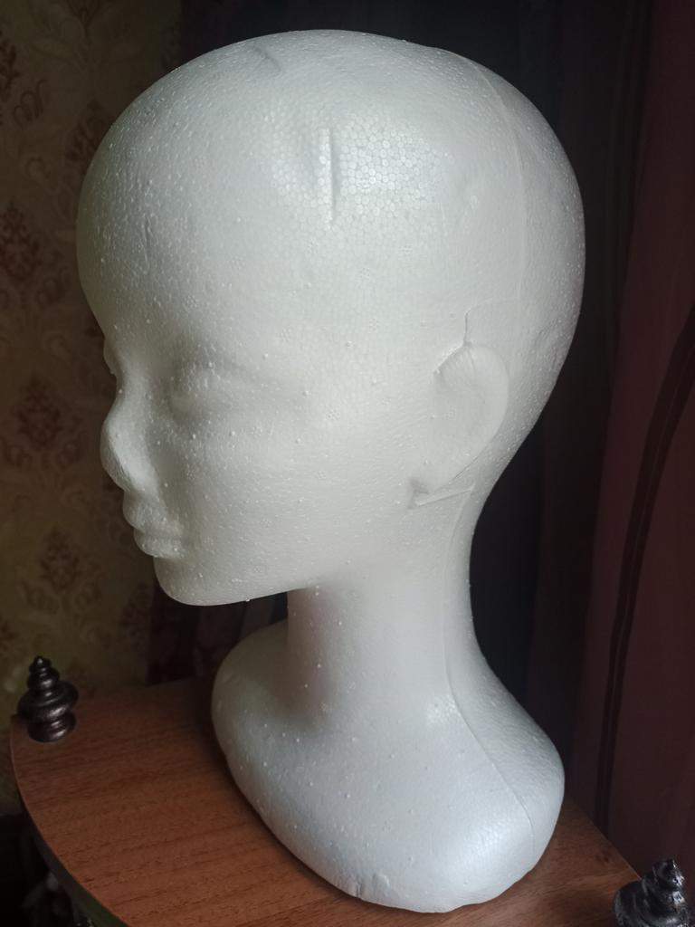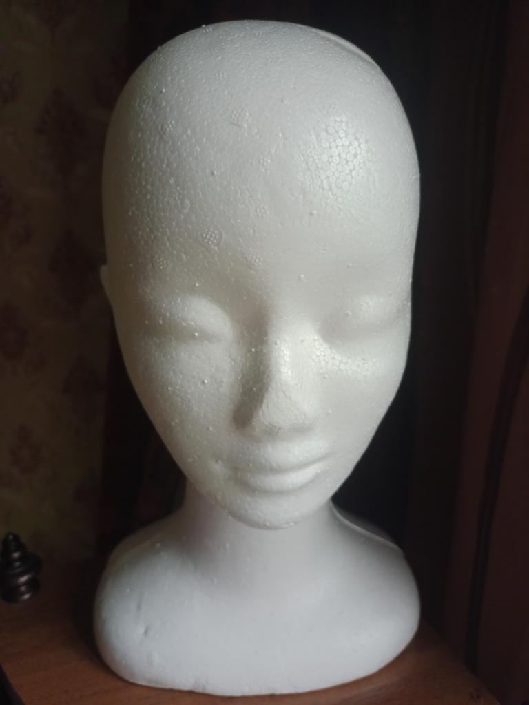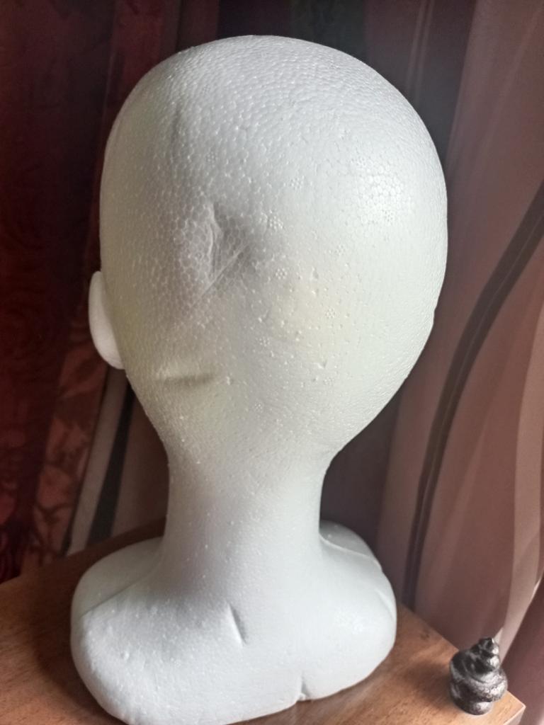 Útil cabezal de poliestireno, para peinar pelucas.