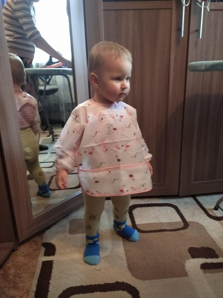 Un babero excelente para un bebé que empieza a alimentarse solo. Tomamos dos diferentes: el que tenía osos era algo más resistente que el que tenía flamencos. Es conveniente que las mangas estén cerradas y que haya un bolsillo en la parte inferior delantera. El bebé come y no se mancha la ropa.