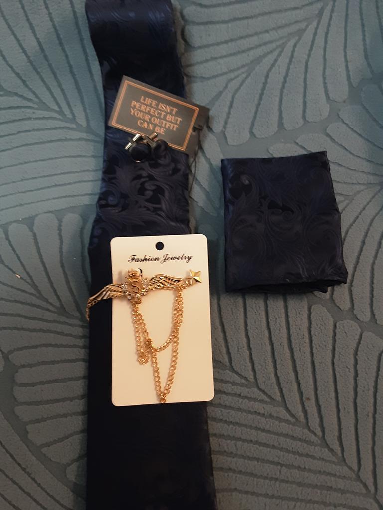 Muy bonita corbata azul oscuro + bolsillo en el pecho con toalla + gemelos + alfiler de corbata - GRACIAS