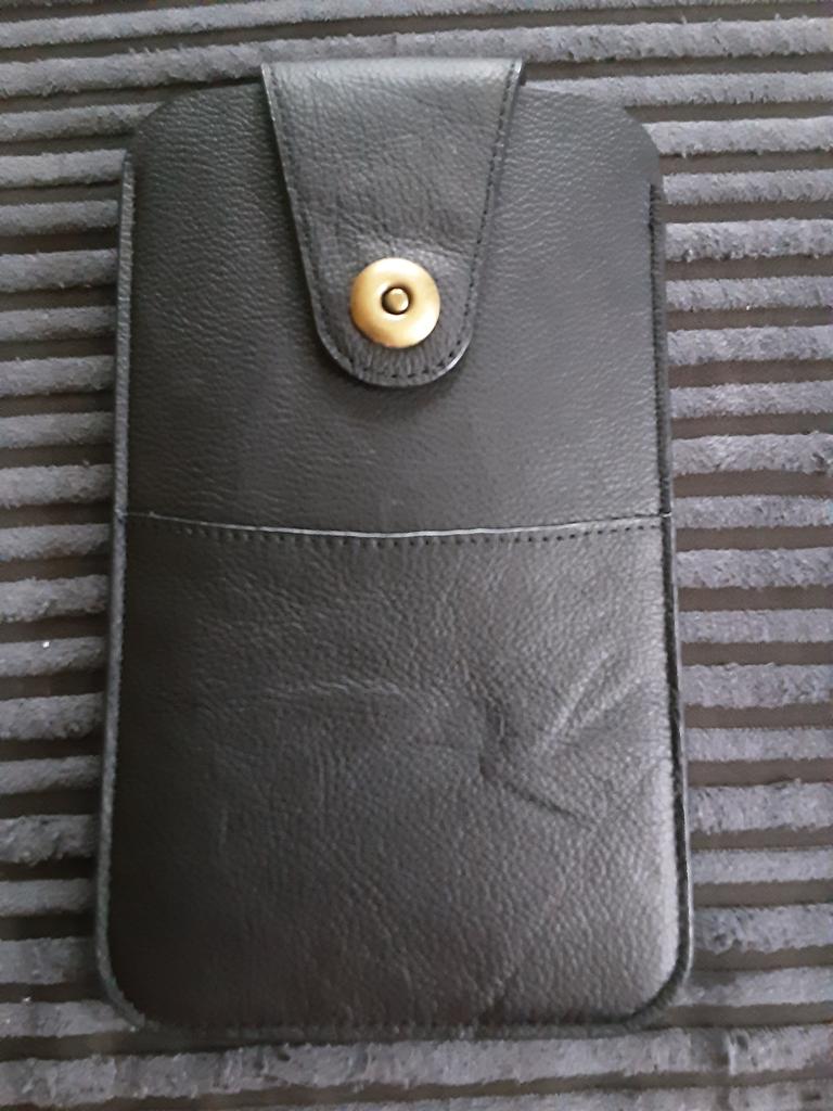 Parece cuero, con forro, solo que no sé para qué teléfono servirá esta funda tipo pistolera, para el "Samsung Galaxy Note 9" es demasiado grande, en la foto "Samsung Galaxy M21 6.4", con dimensiones similares.