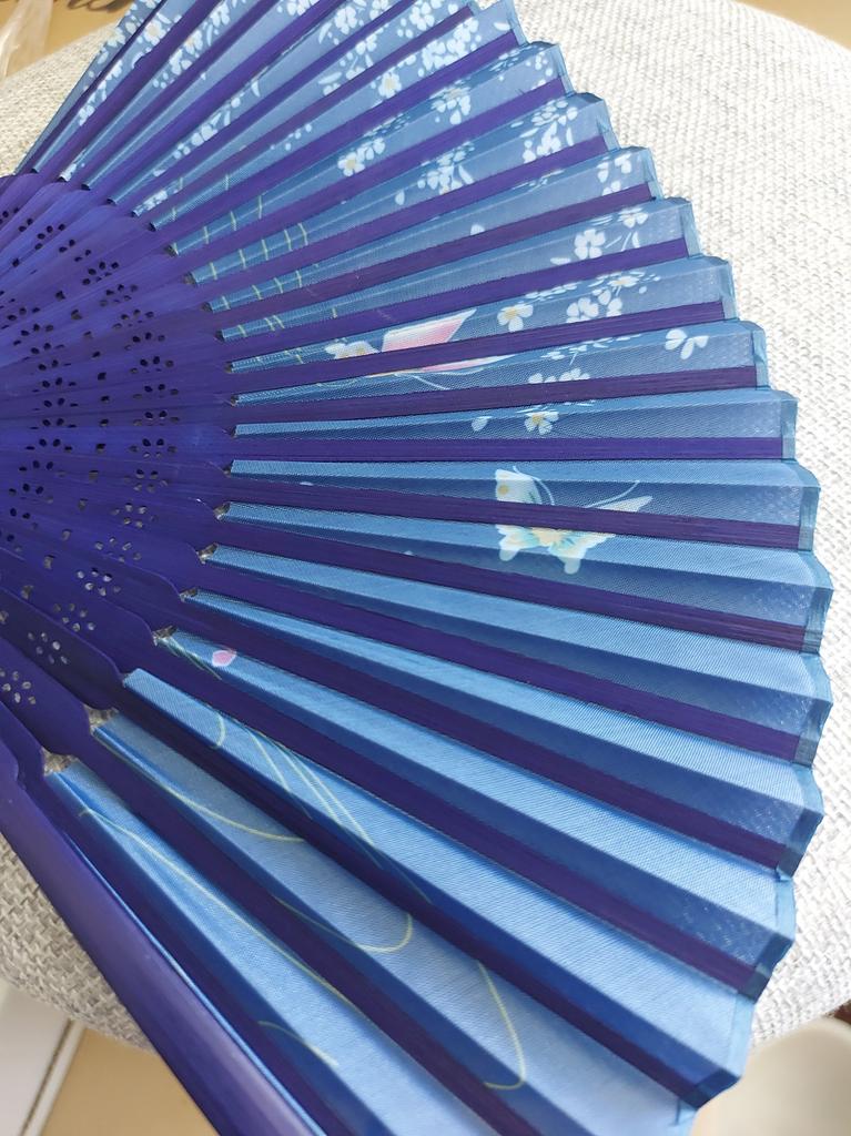 Muy bonito, compacto, se siente ligero en la mano. Estampado precioso. Produce suficiente flujo de aire para abanicarse.