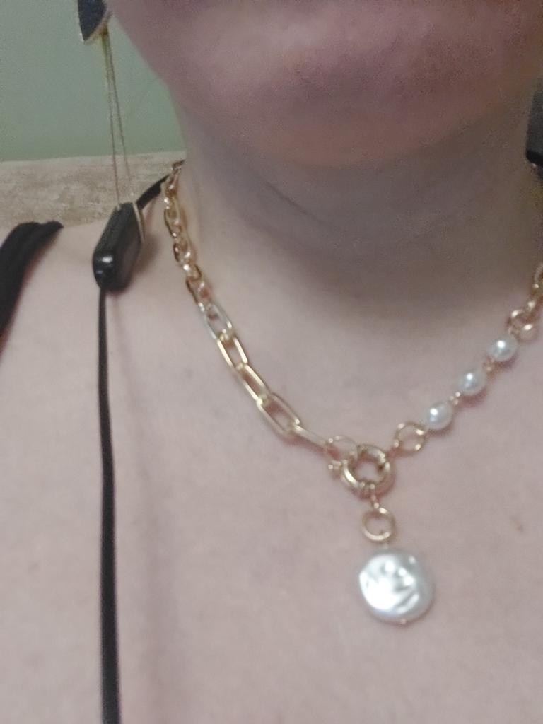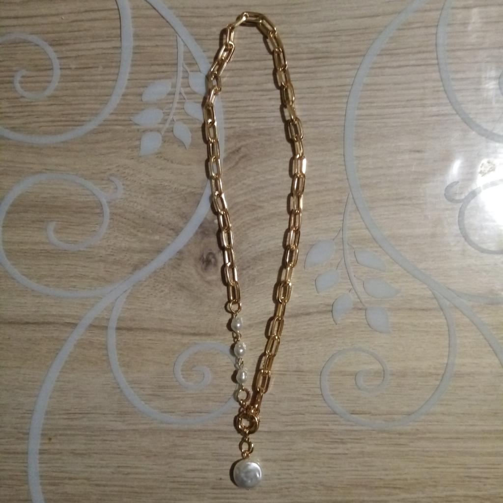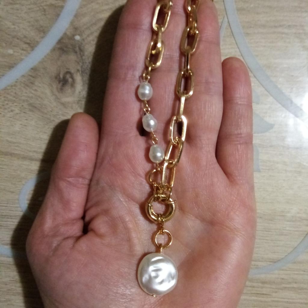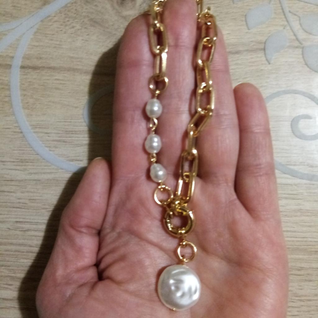 Colgante con perlas muy bonito y elegante, no usar con perfume porque se pone un poco oscuro, por lo demás todo genial para el precio que tiene. Lo uso casi a diario y me encanta!!!