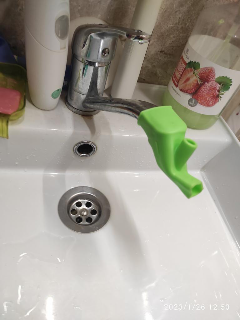 Pon el grifo. Pero me gustaría que fuera más largo. Aquí todavía salpica, pero menos. Corresponde a la descripción, pero mirando quién tiene qué grifo.