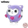 WOSTU Enamel Cartoon Purple Owl 925 Sterling Silver Charm Beads fit Bracelet Bangle Fine Jewelry