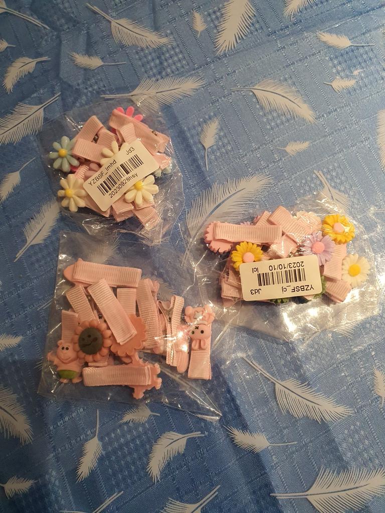 Las horquillas para el cabello son muy buenas, con cinta para no rayar. Se ven muy lindos. Las flores son un poco más toscas en ejecución que las de la foto del vendedor, pero en principio no es crítico. Entrega mes+, en un solo paquete con otros pedidos.