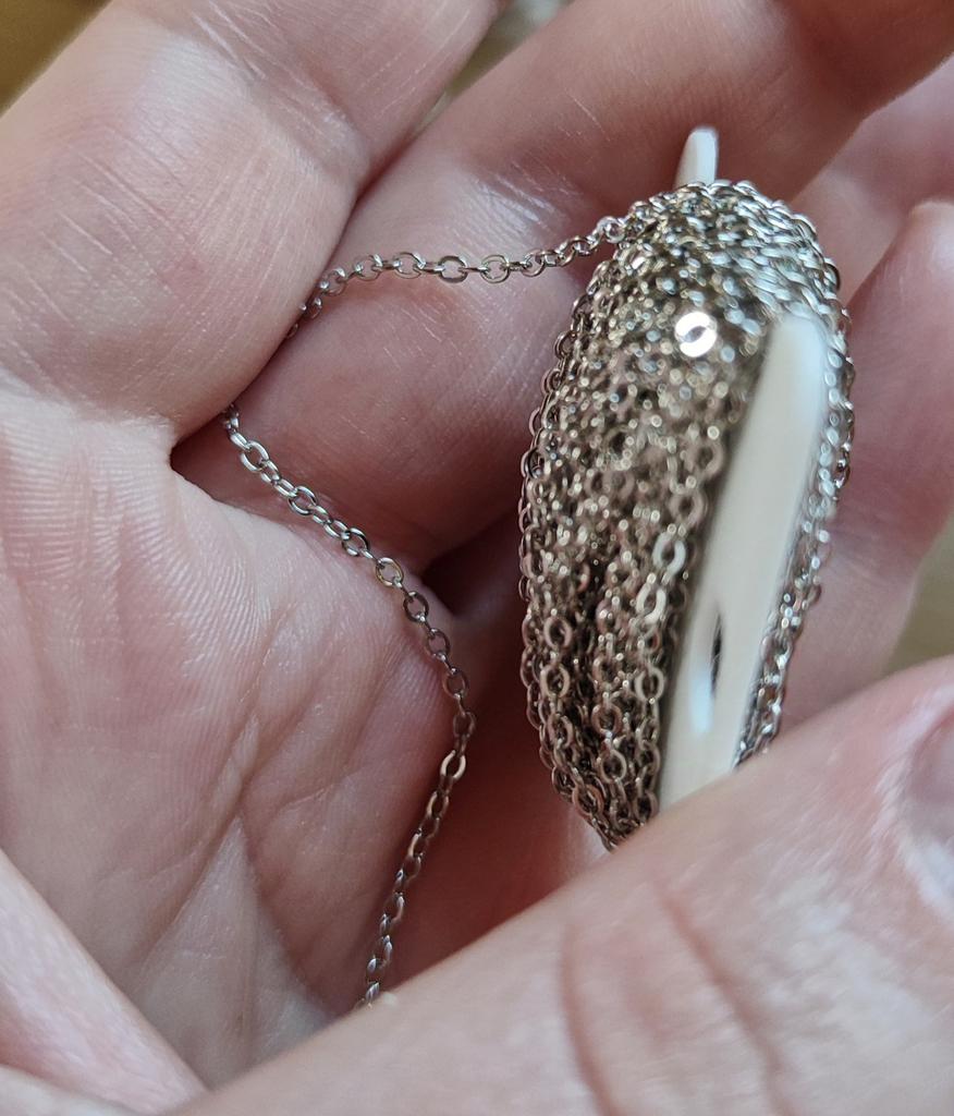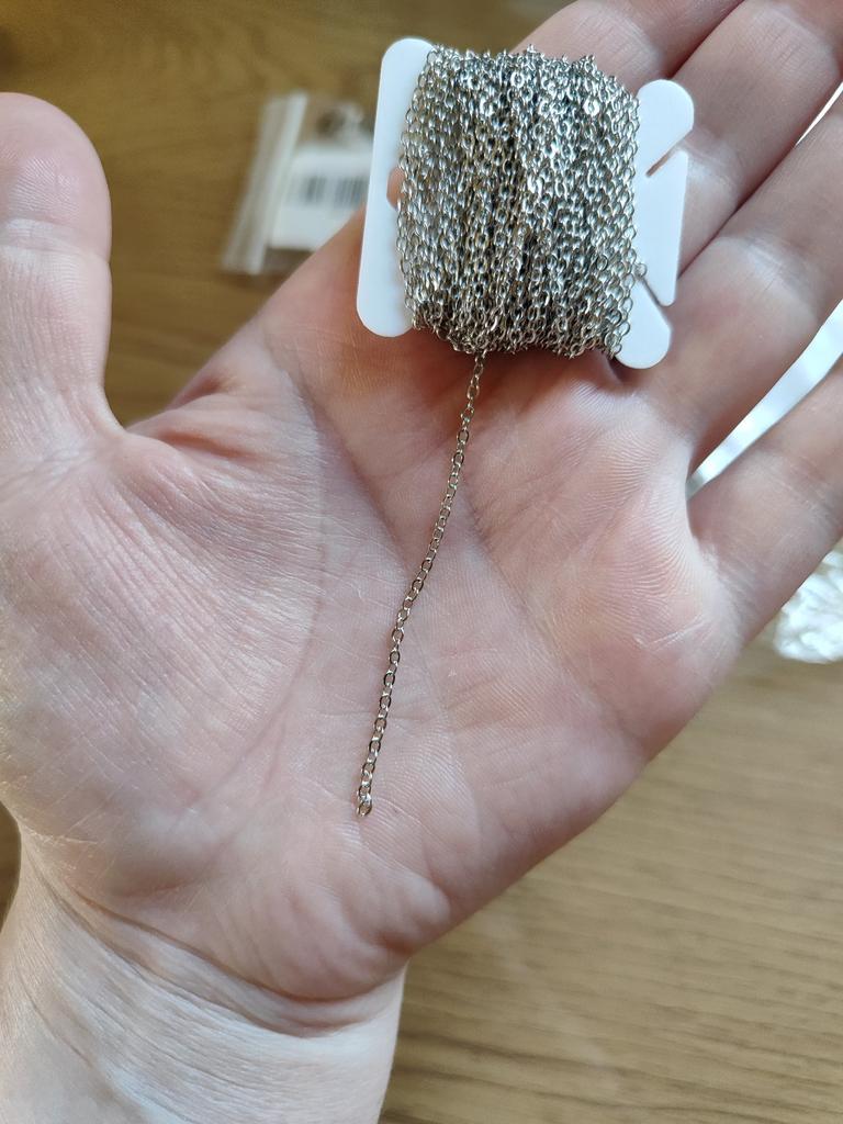 Cadena fina pero resistente. Eslabones bonitos y uniformes sin rebabas. Parece que no se oxida por el contacto con las manos.
