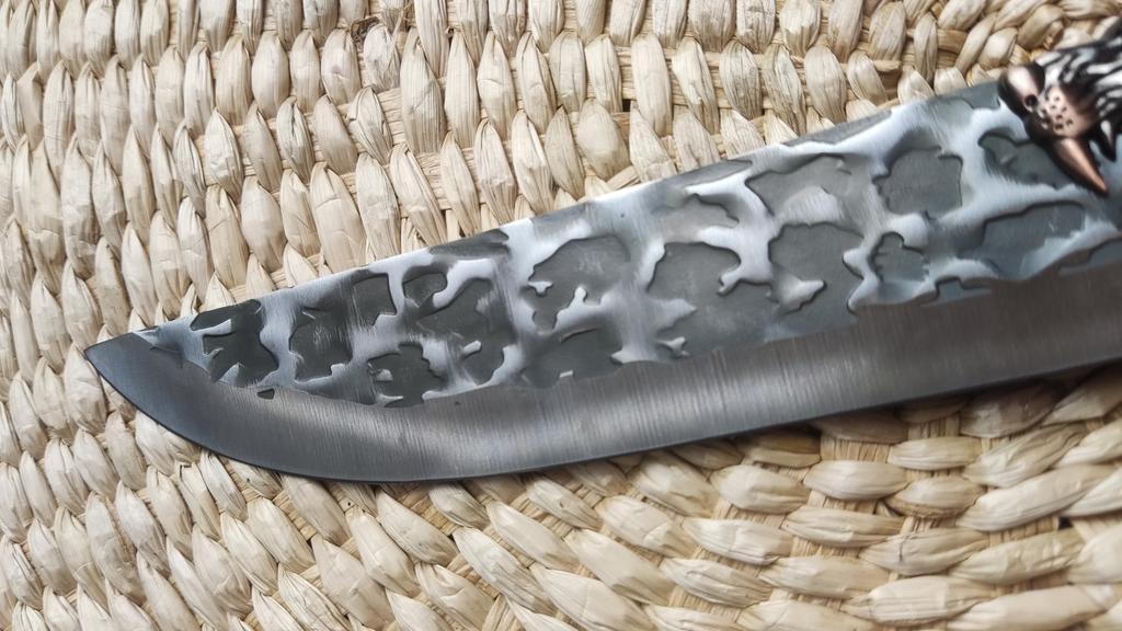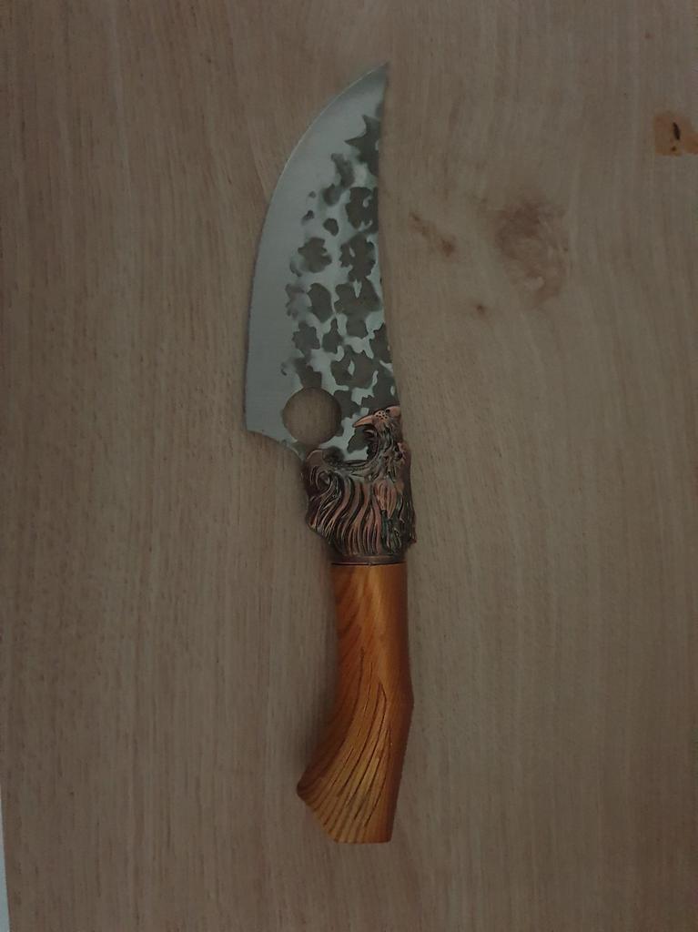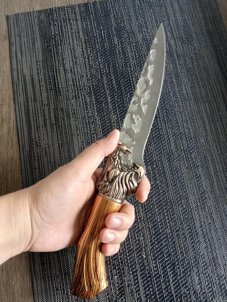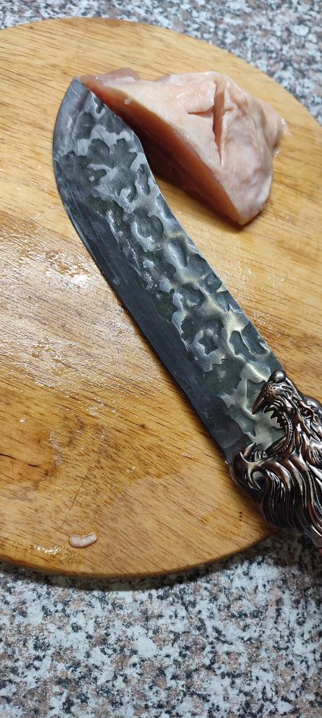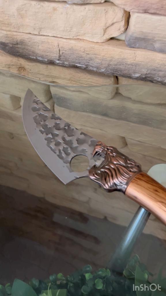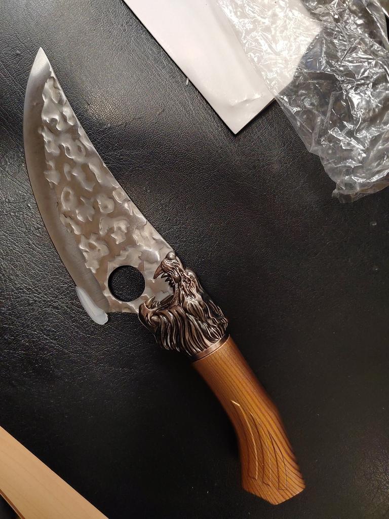 Cuchillo para deshuesar forjado ⭐⭐⭐⭐⭐ Wow 🤩 Estoy súper impresionado con este cuchillo. Es un cuchillo hecho a mano. es muy fuerte Me gusto el diseño en si. El mango es ligero. Pero la hoja es pesada.. *Los cuchillos para deshuesar tienen hojas largas, delgadas y flexibles con una punta afilada para que perforar la carne sea más fácil y seguro. La hoja está diseñada para cortar ligamentos y tejido conectivo para eliminar la carne cruda del hueso.. Hay otras opciones de cuchillos: con funda y sin. Pedí con una funda. Y el paquete viene dentro de una caja segura.