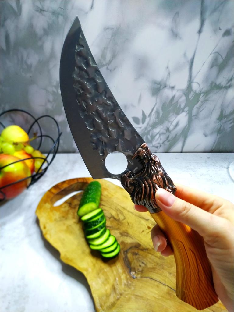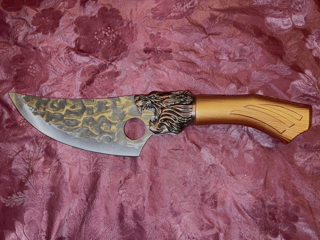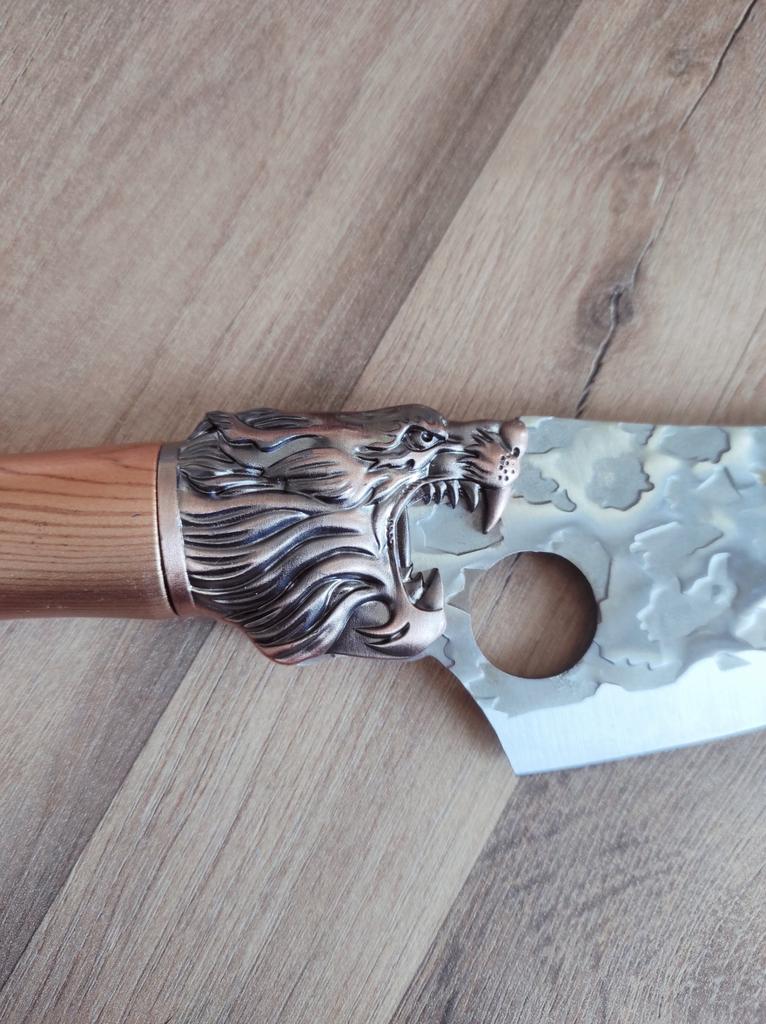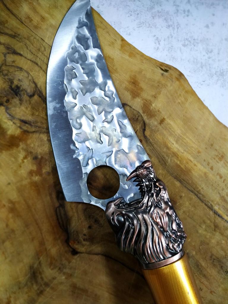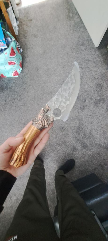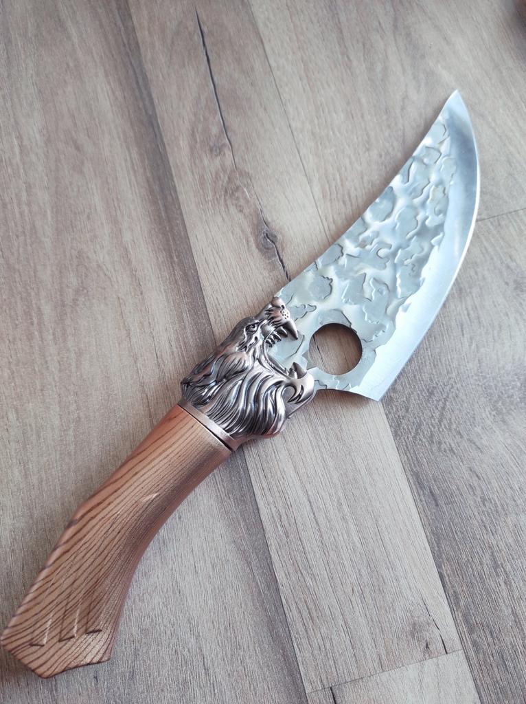 🔪Cuchillo de cocina fuerte en un gran diseño 🔪Distintas versiones disponibles 🔪Hoja de acero inoxidable afilada y estable 🔪Grandes decoraciones en la hoja y más estilizadas Cabeza de lobo en el mango. 🔪Agujero en la hoja para ejercer presión cuando poder cortar 🔪 Entregado rápidamente y bien embalado 🔪Buen precio para esta calidad 👍