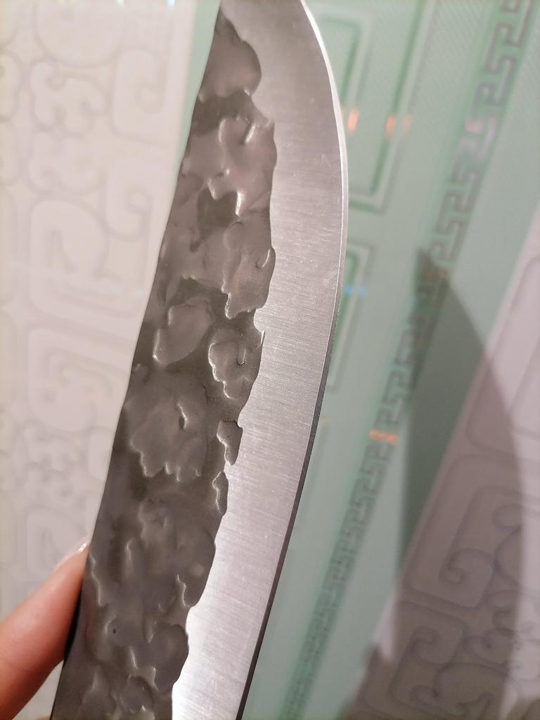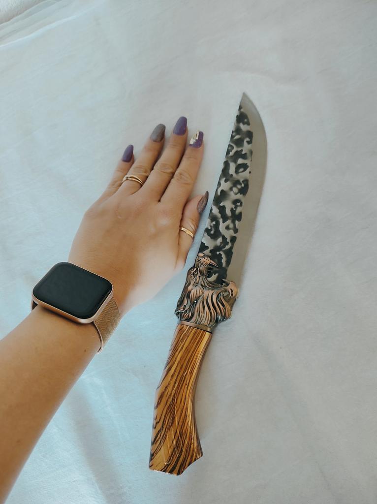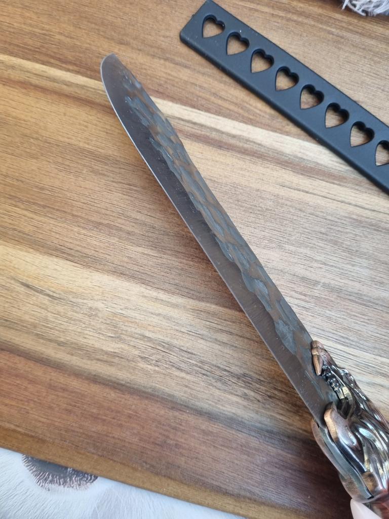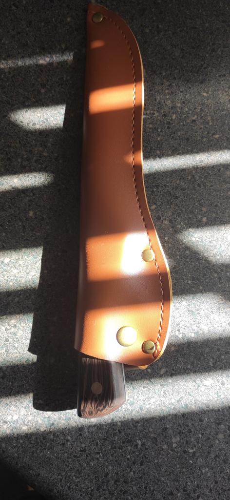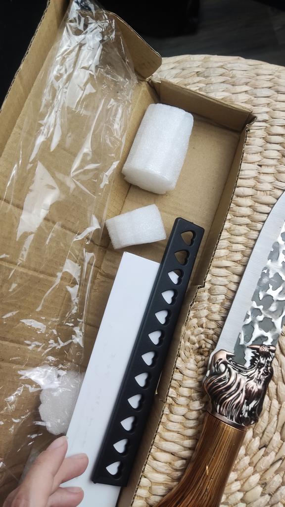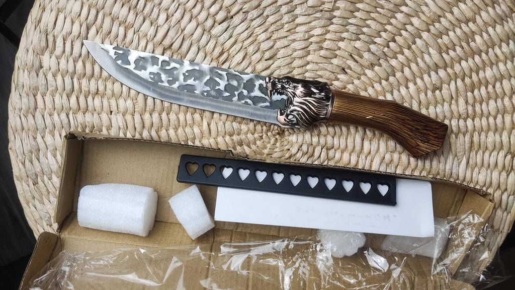 El cuchillo 🔪 llegó en perfectas condiciones, bien embalado y protegido. 🚚 El mango es hermoso, con atención a los detalles, como la hoja, que es afilada y muy cortante. ➡️ Viene con el cubrecuchillas incluido.✅ Excelente en la cocina 🍕🍖🍗