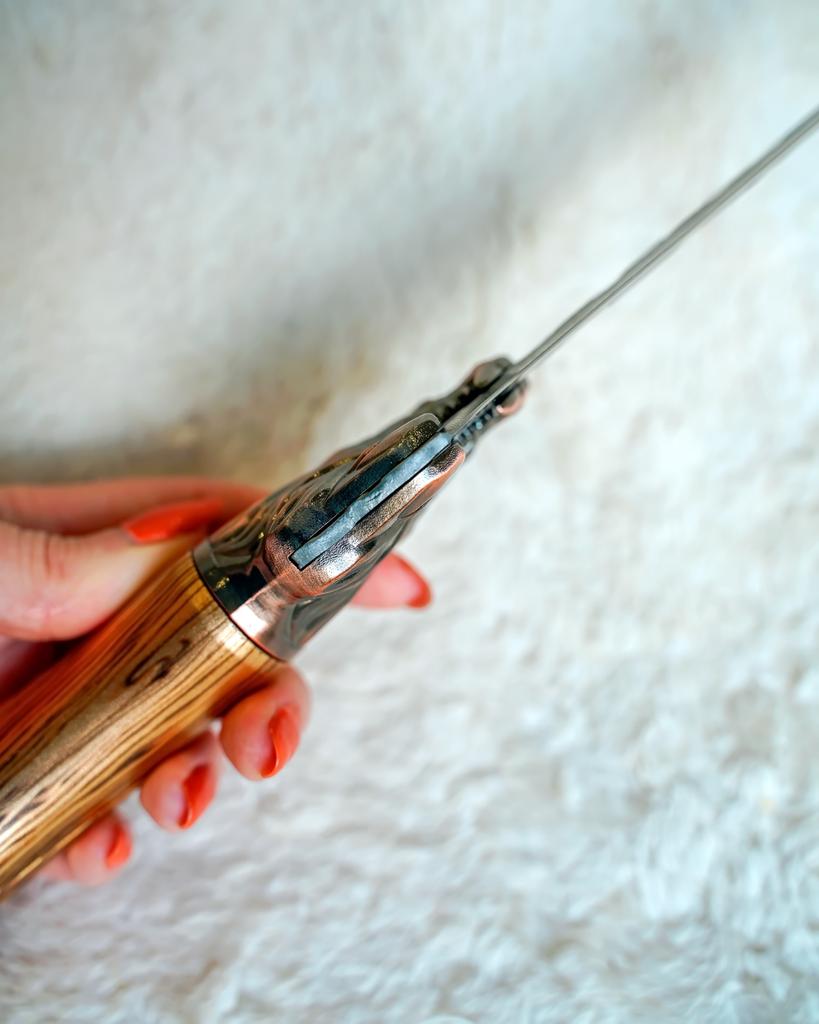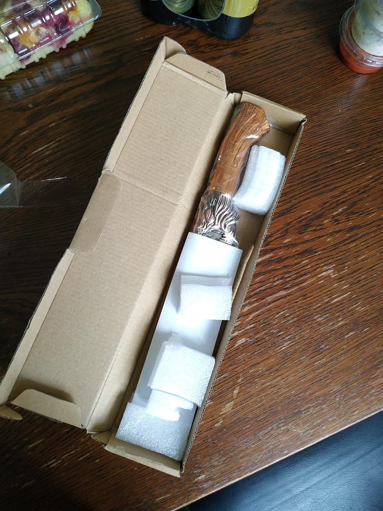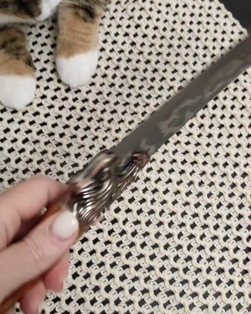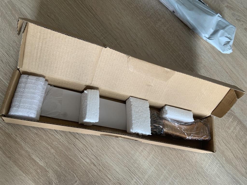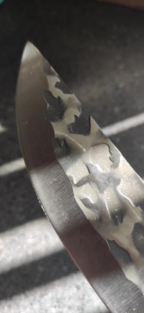 El cuchillo 🔪 llegó en perfectas condiciones, bien embalado y protegido. 🚚 El mango es hermoso, con atención a los detalles, como la hoja, que es afilada y muy cortante. ➡️ Viene con el cubrecuchillas incluido.✅ Excelente en la cocina 🍕🍖🍗