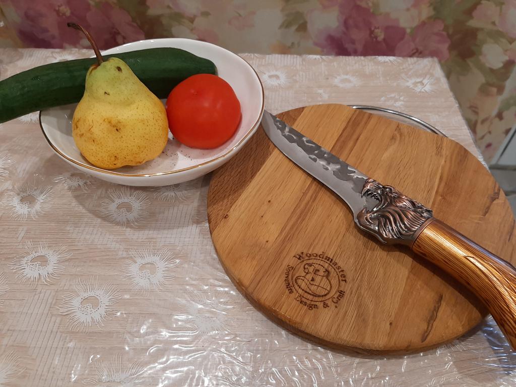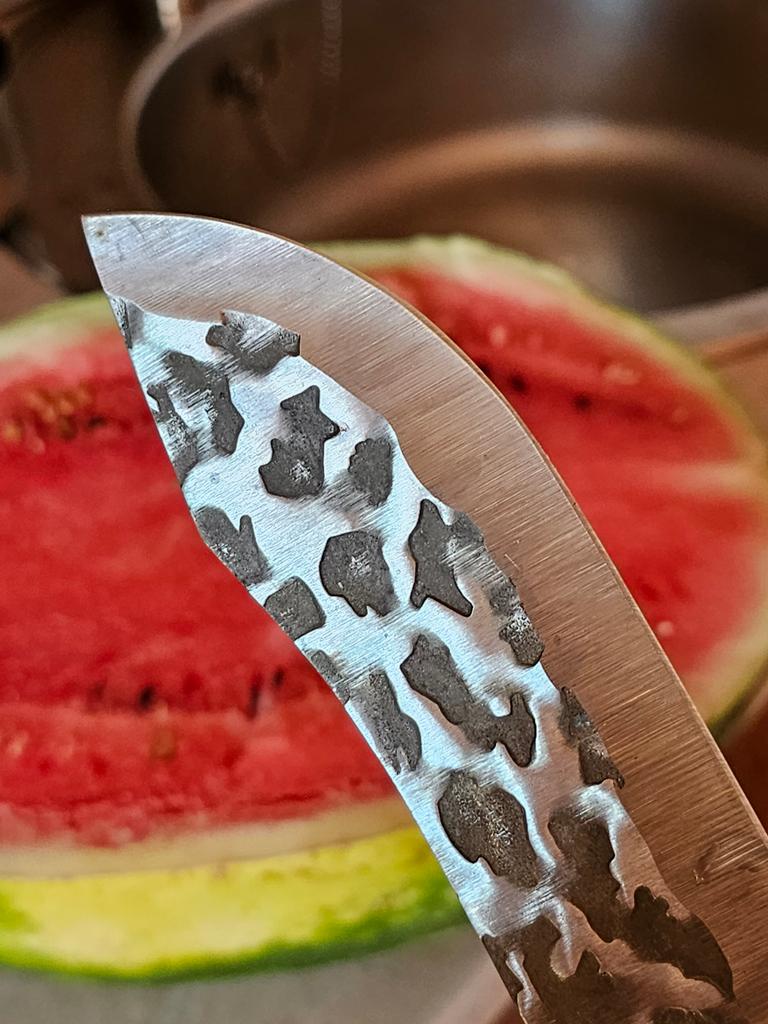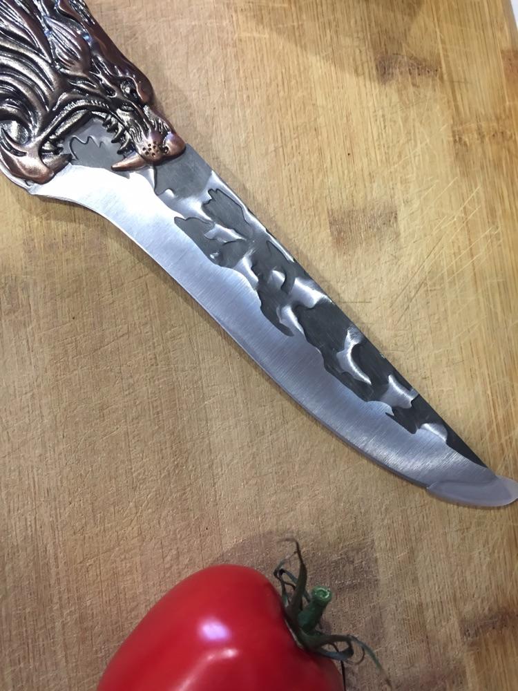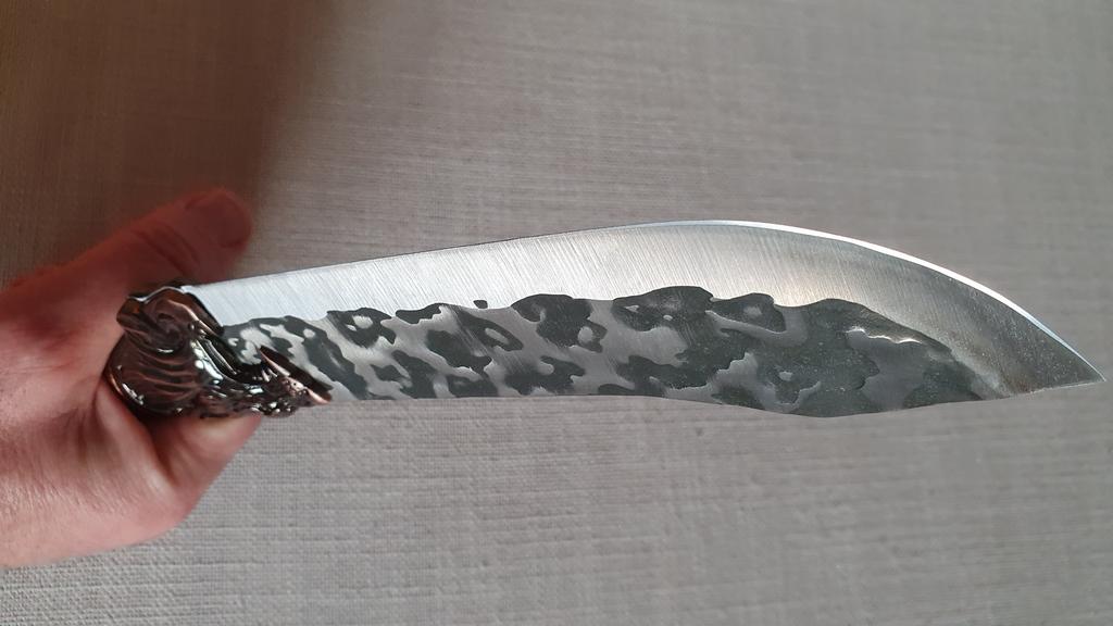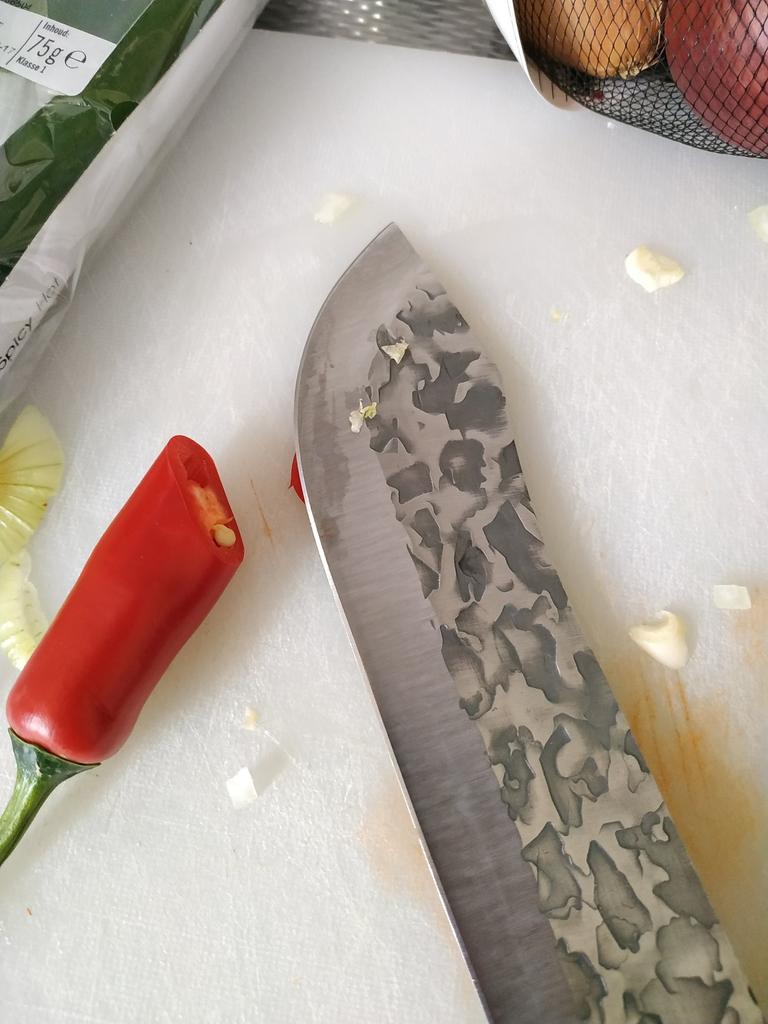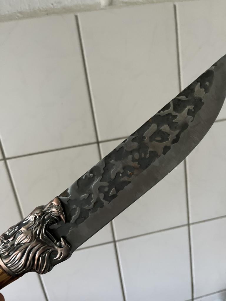 ¡Ahora tengo un nuevo ayudante para asar a la parrilla! No soy un "profesional de la cocina", pero siempre quise un cuchillo sólido hecho de acero real con un gran aspecto en mi cocina al aire libre.. La hoja es realmente sólida y bellamente acabada. - Está hecho de acero de aproximadamente 3 mm de espesor y da una impresión individual. El mango está hecho de plástico. león metálico. Límpielo inmediatamente con agua caliente.. El primer corte fue muy exitoso. Tomates, cebollas, papas, panecillos frescos, luego carne, todo cortado con precisión y sin ningún problema.