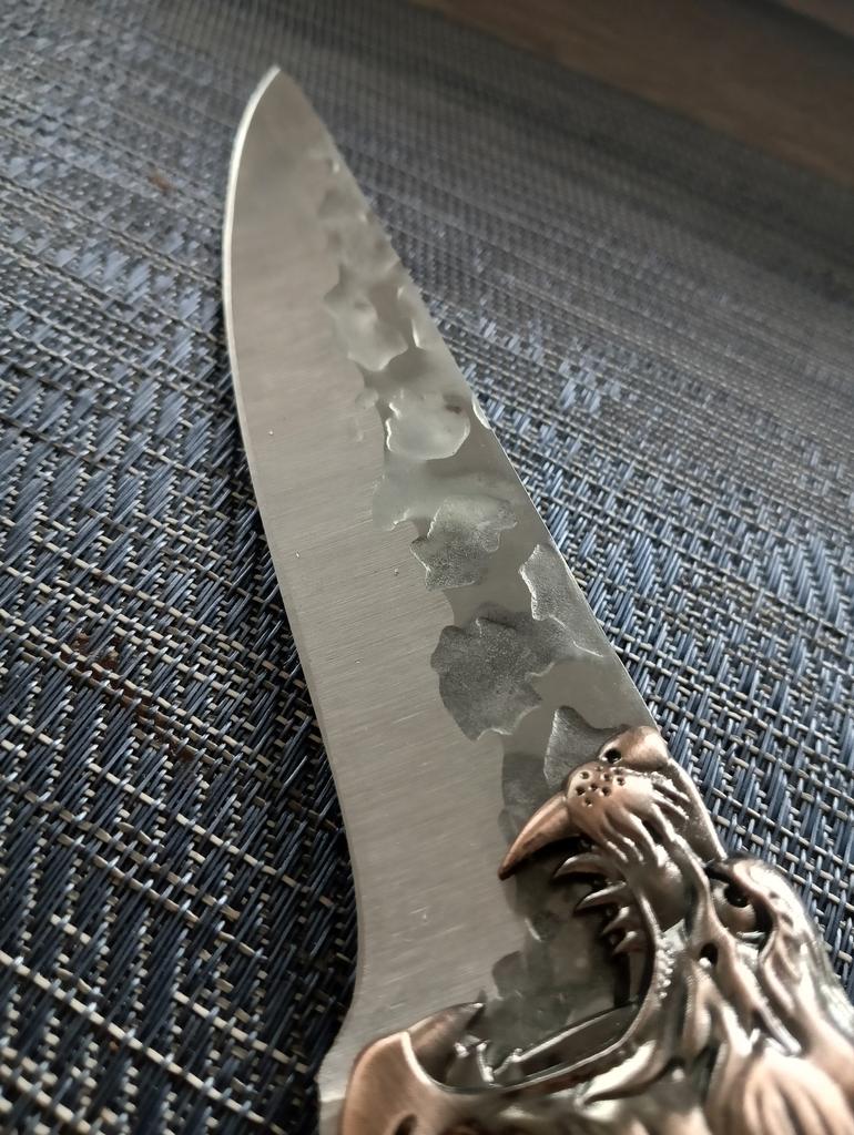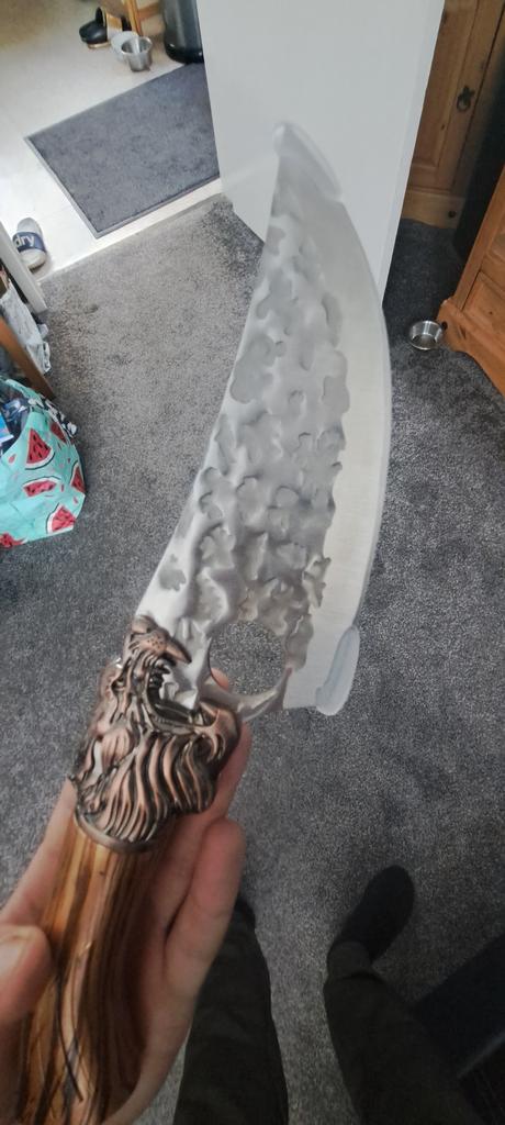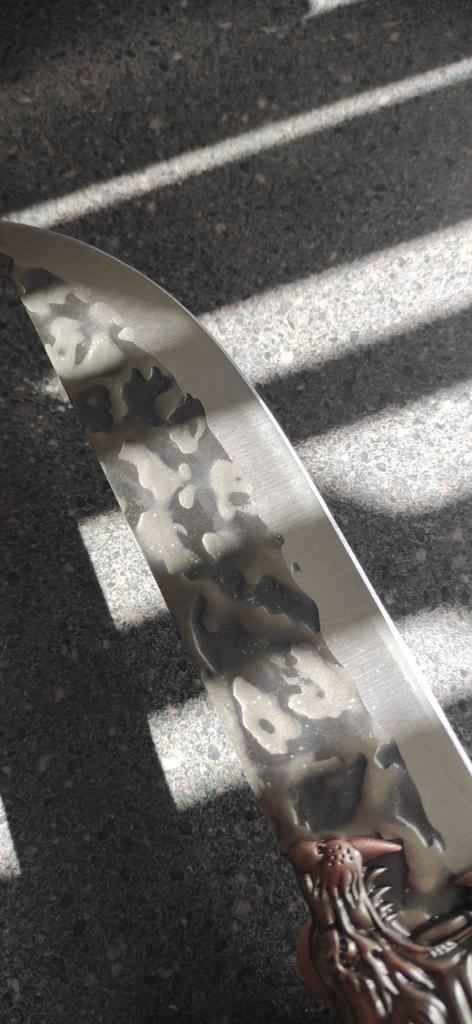 Cuchillo grande como el de Juego de Tronos Y realmente parece un accesorio de rodaje: espectacular desde lejos, plástico si se mira más de cerca 🤣 Sinceramente esperaba más de este cuchillo. El mango de plástico y la cabeza de lobo de plástico tienen buena pinta, pero sólo si no los miras de cerca, y no resultan muy agradables al tacto. Aunque bien dibujado y pintado. El cuchillo es grande, afilado y de metal grueso. En la propia hoja también hay solo un dibujo, no un grabado; en una palabra, un accesorio 🤷♀️ Ideal para una fiesta estilizada, pero poco probable para algunos fines prácticos.