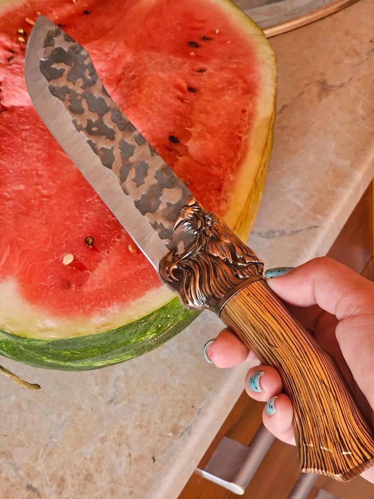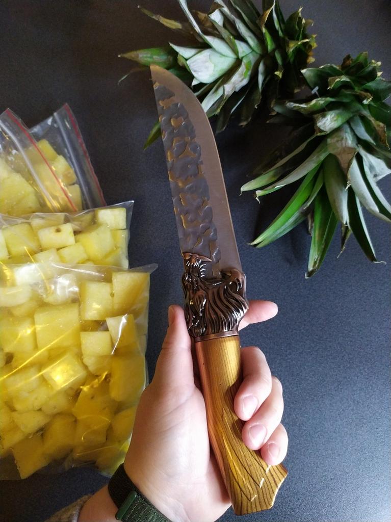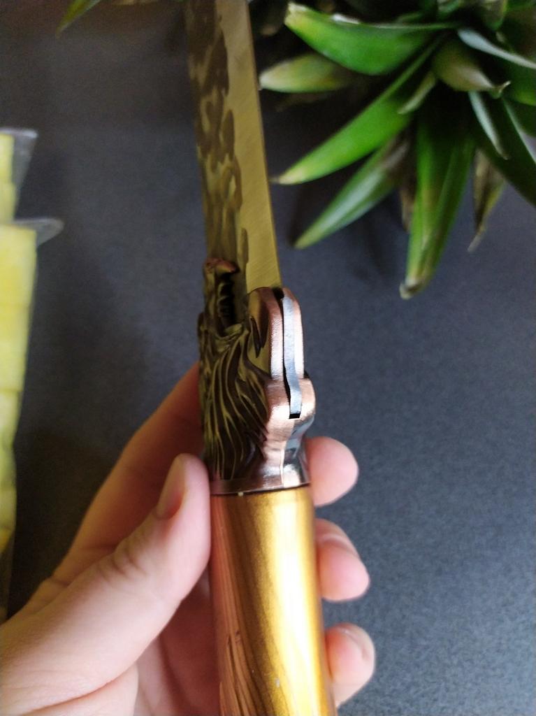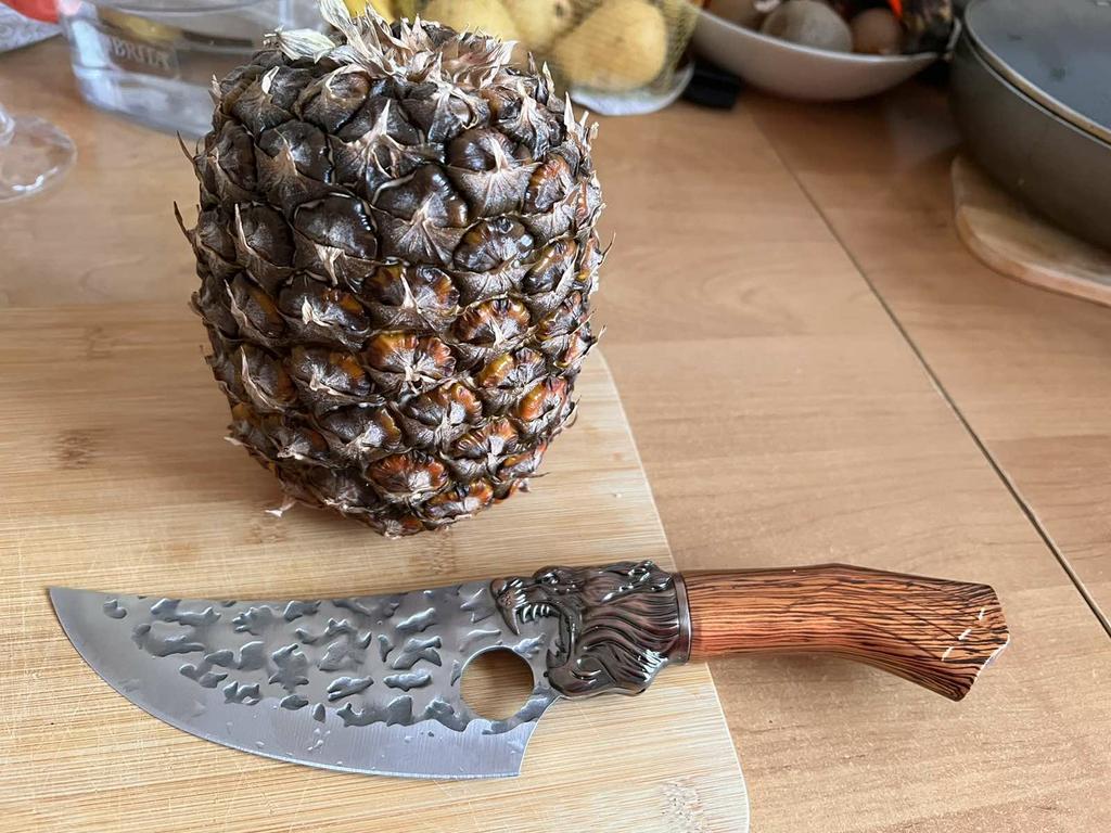 Este cuchillo es genial!! Cortar una piña nunca ha sido tan fácil 😍 No hay mucho que alabar sobre un cuchillo. Al fin y al cabo, lo único que queremos es cortar bien y que nos dure el mayor tiempo posible. Bueno, todavía no sé sobre esto último, ¡pero puedo garantizarte que corta increíblemente! Tan bueno que pedí otro 😁 El mango parece estar hecho de madera, sin embargo, es muy suave y agradable para trabajar, sin mencionar el hermoso tinte que tiene. La hoja, por otro lado, es afilada, gruesa y resistente. 💪🏻 También tiene un patrón genial. Sin embargo, la conexión entre la hoja y el mango marca la diferencia. ¡Ese tigre tallado en metal se ve tan genial! Estoy obsesionado 🐅 Llegó rápido, en una caja de cartón con rellenos de espacio alrededor. Servicio brillante y producto de alta calidad. Te lo recomiendo 💯 Sígueme en instagram @serendipityssynchronicity 📸 💛