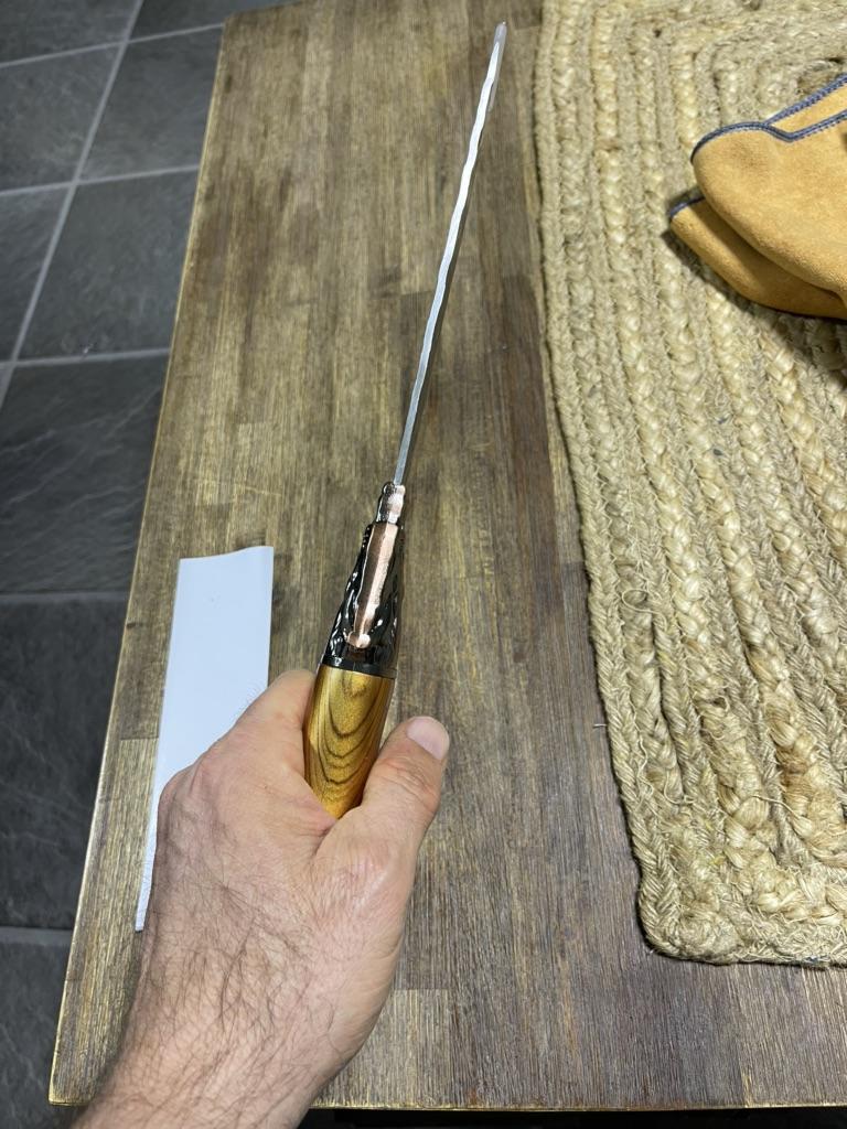 hola espero que estes bien ? Acabo de recibir mi hermoso cuchillo de acero inoxidable.. No es ni demasiado ligero ni demasiado pesado.. Los detalles son realmente hermosos.. La hoja está muy bien afilada. No tuve problemas para cortar carne en rodajas finas. El diseño es realmente hermoso. Recibido muy rápidamente en Francia y muy bien embalado.. es una gran idea para un regalo
