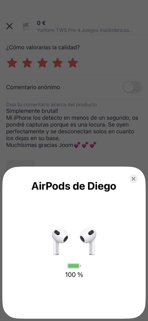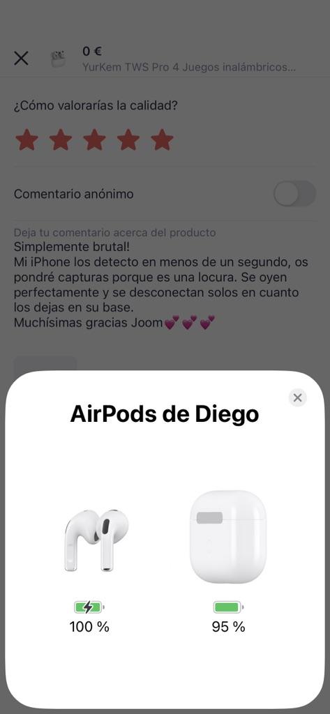 Simplemente brutal! Mi iPhone los detecto en menos de un segundo, os pondré capturas porque es una locura. Se oyen perfectamente y se desconectan solos en cuanto los dejas en su base. Muchísimas gracias Joom💕💕💕