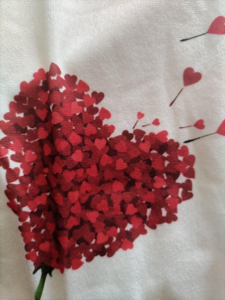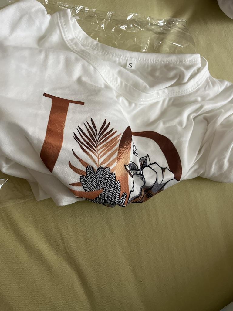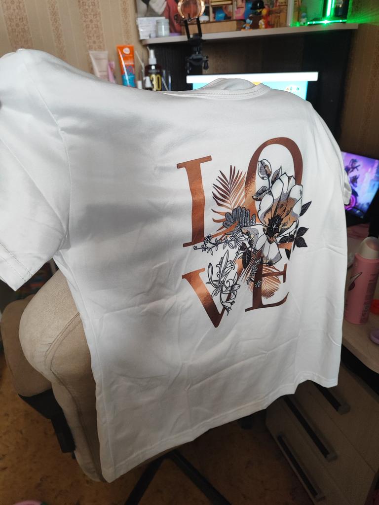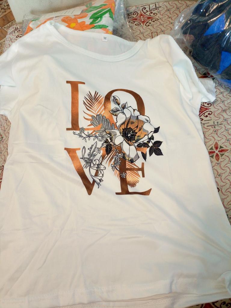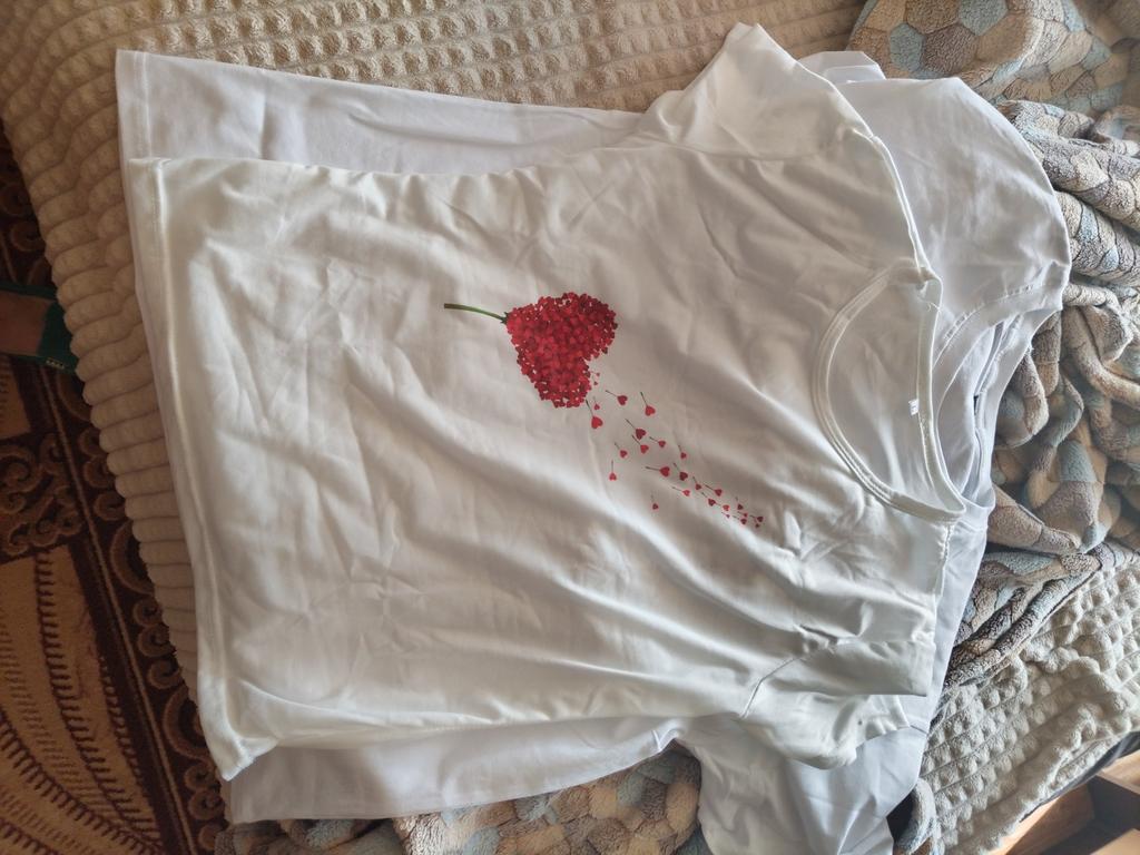 La camiseta es bonita. El dibujo está estampado en la tela, no es una pegatina. El color es brillante. La camiseta es sintética, pero suave y agradable al tacto. Para la talla 46, cogí una camiseta 3XL. Me preocupaba que fuera demasiado grande. Pero todo quedó bien, la camiseta es holgada, pero no parece grande. Para quienes la quieran ajustada, deben coger una talla menos.. Por qué quité 1 estrella: es por las mangas. En la foto parece que es una camiseta con mangas que tienen vueltas, pero en la vida real es una camiseta normal con mangas normales. Su aspecto es algo más sencillo que en la foto. En general, estoy satisfecha con la compra. Recomiendo.