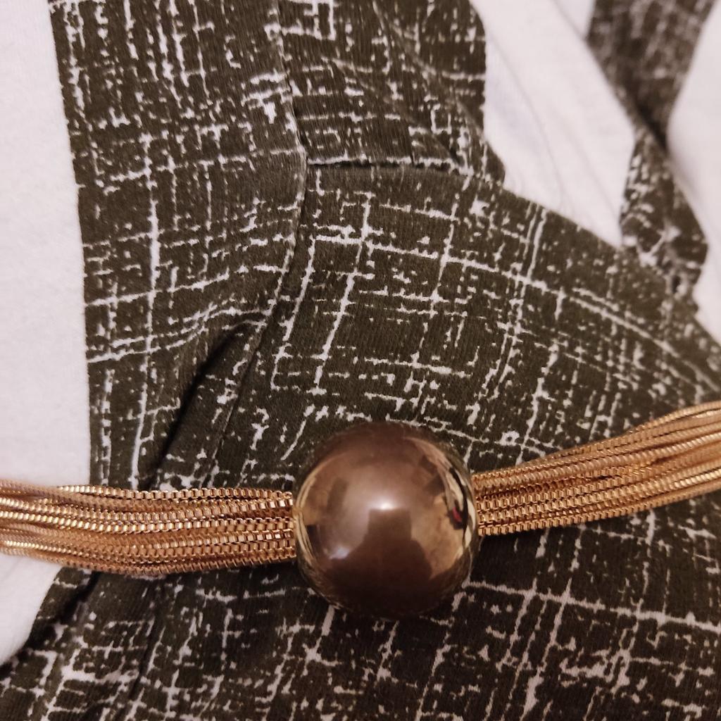Queda muy bonito y elegante debajo de un vestido con cuello en V, como en la imagen. También compré una pulsera, aunque se tuerce (lo sabemos y todavía la compramos por un juego)😅