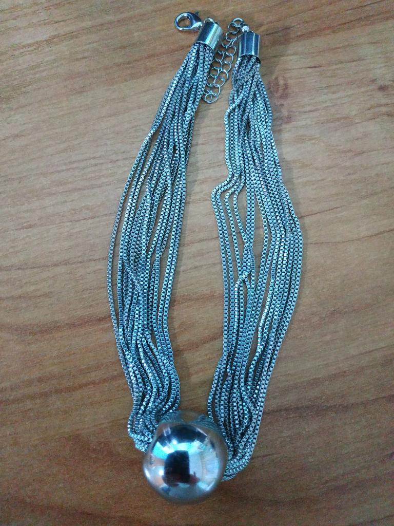Un collar de 14 cadenas con una bola de metal redonda, moderadamente pesada, también se encargó una pulsera.