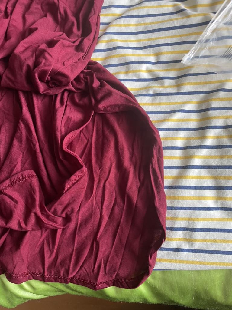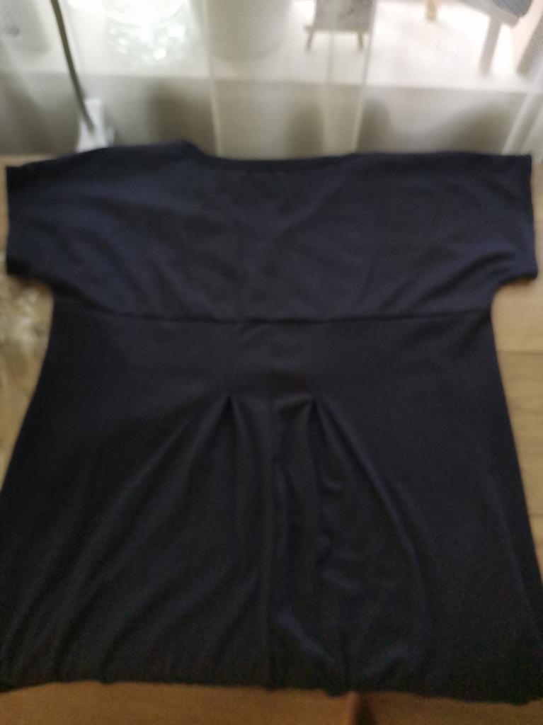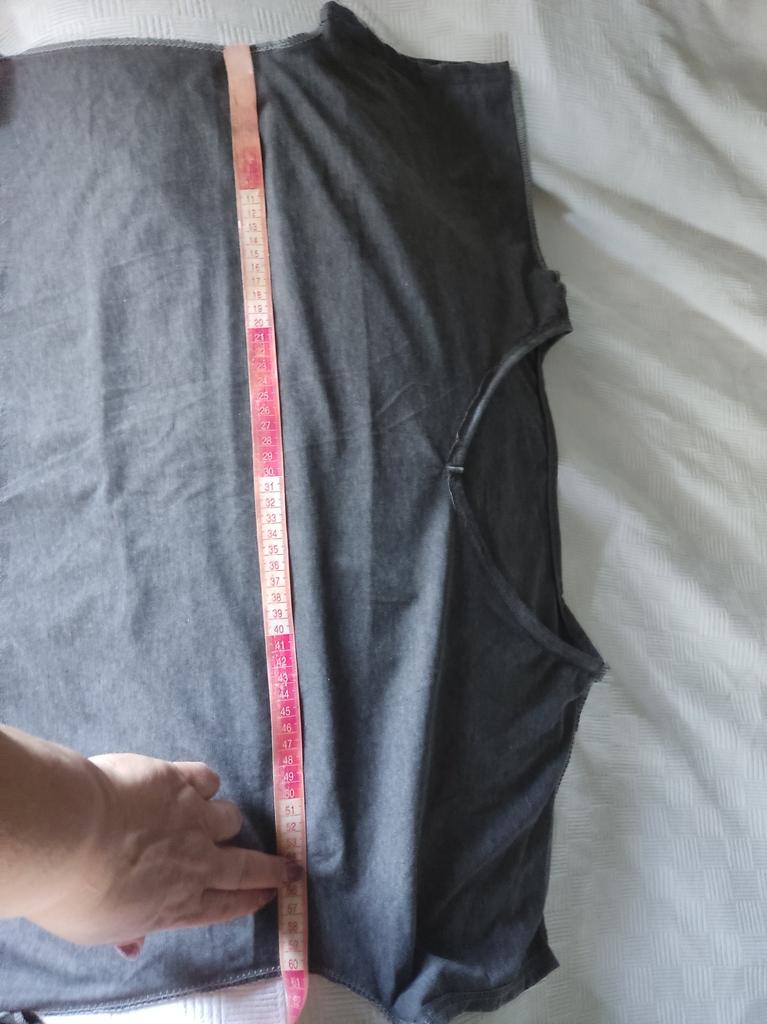 Vestido de punto como en las camisetas. Ideal para el verano caluroso. Me queda holgado para la talla 50. Tiene aberturas laterales y bolsillos en las costuras laterales. Tres pliegues en la espalda. Y si te lo pones al revés, queda mucho más interesante, solo que el canesú pasa por el centro del pecho. Hay que retocarlo un poco. Gracias.
