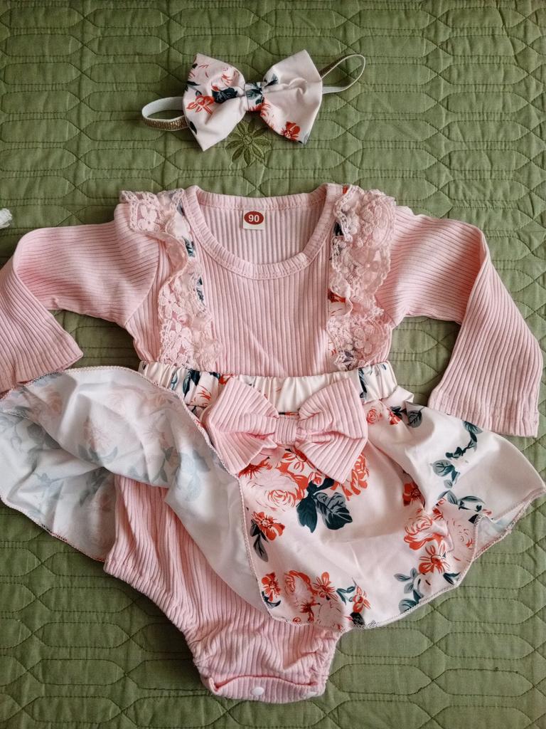 Conjunto de mameluco estilo vestido para niña recién nacida, mono con estampado Floral de retales de encaje de manga larga + conjunto de diadema con nudo de lazo