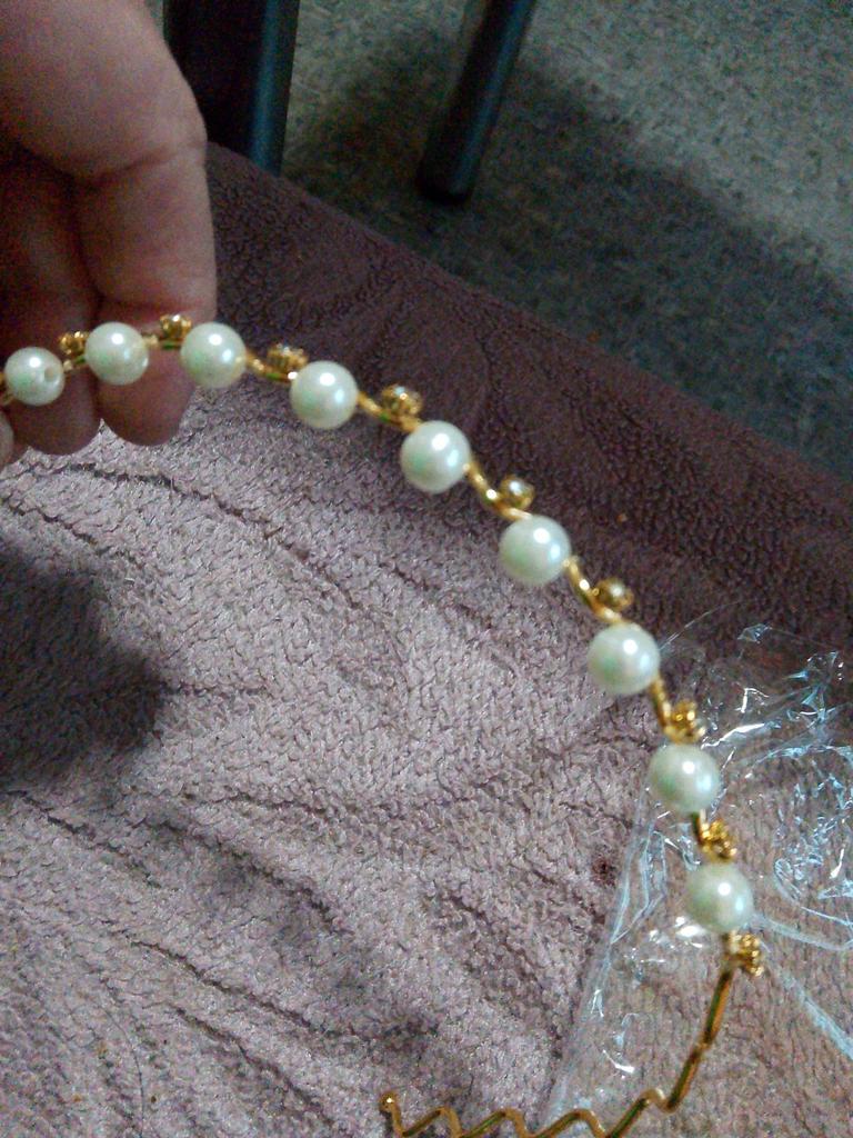 La perla defectuosa está atada a la diadema con un fino hilo de pescar y no está asegurada con un nudo en el extremo. La cola del hilo de pescar es muy pequeña y es imposible atarlo.. La diadema en la cabeza del niño.. No apto para adultos: queda demasiado ajustado y no se ajusta sobre las orejas.