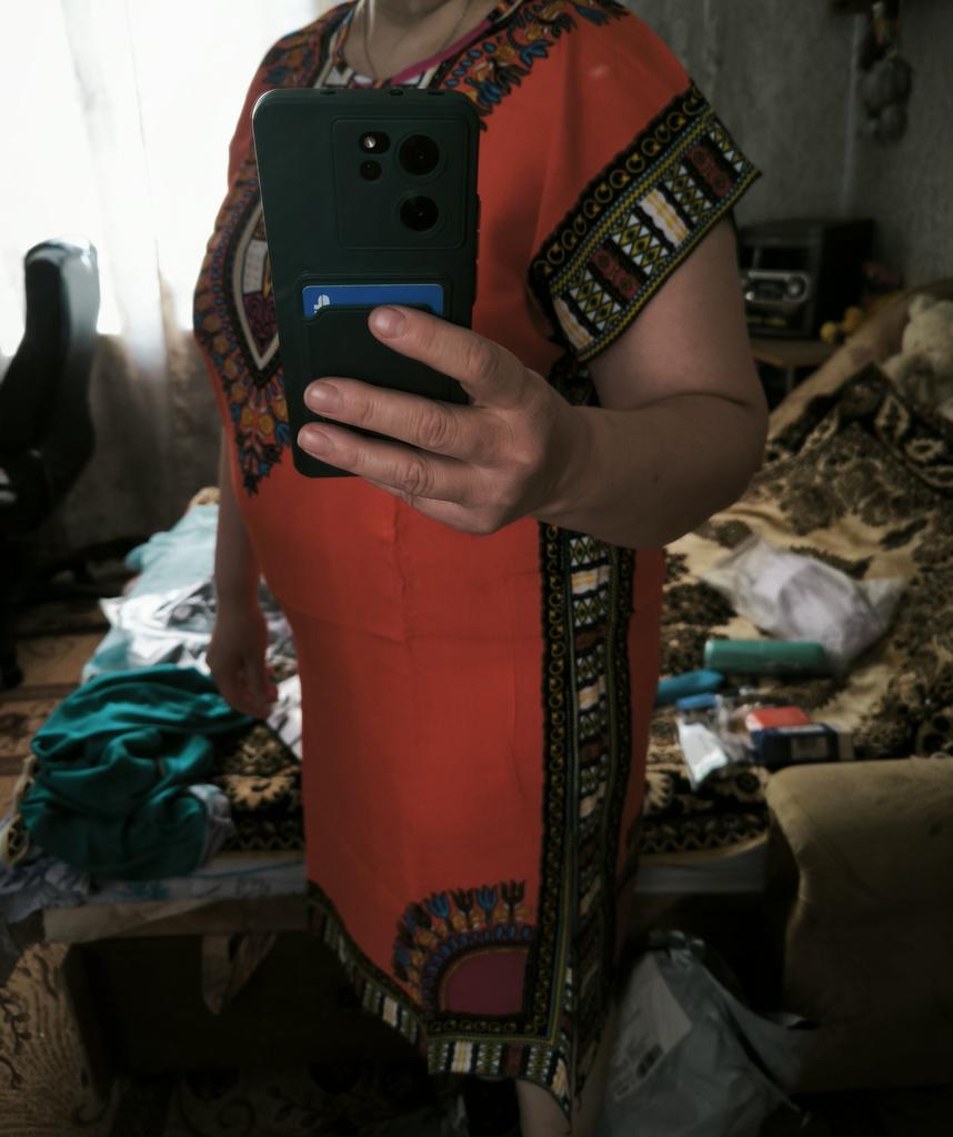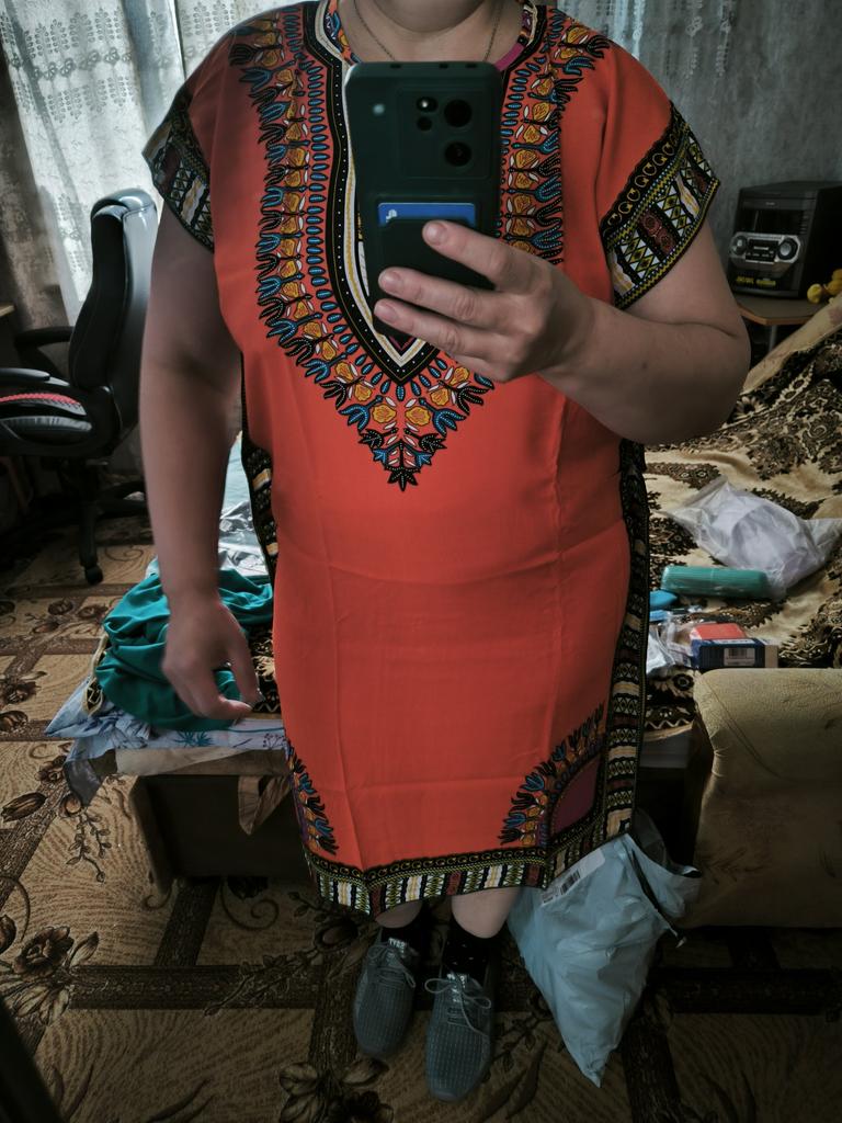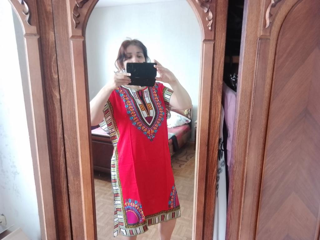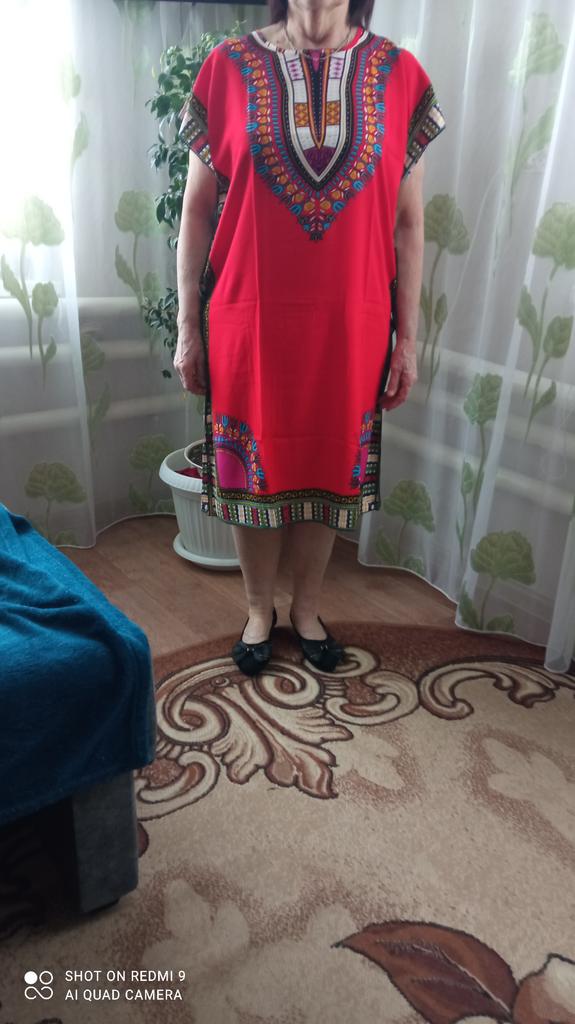El vestido es genial. La tela puede que sea staple, parece eso. Lástima que para una altura de 170 es un poco corto, solo cubre las rodillas. Para un contorno de 100 es holgado, como yo quería. Gracias