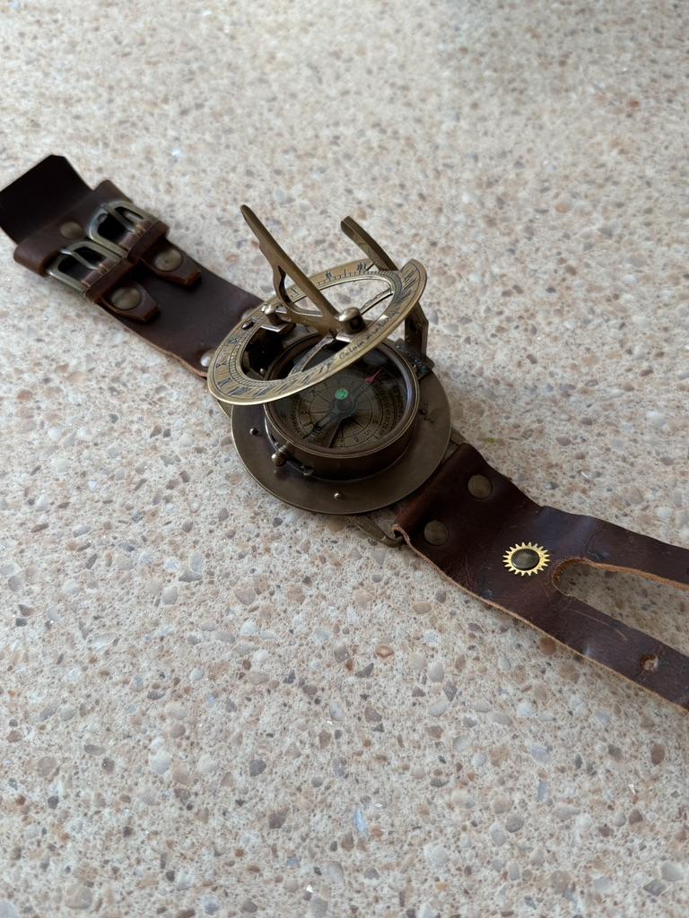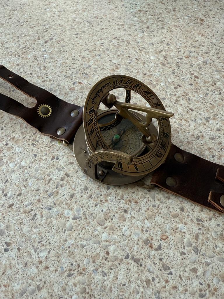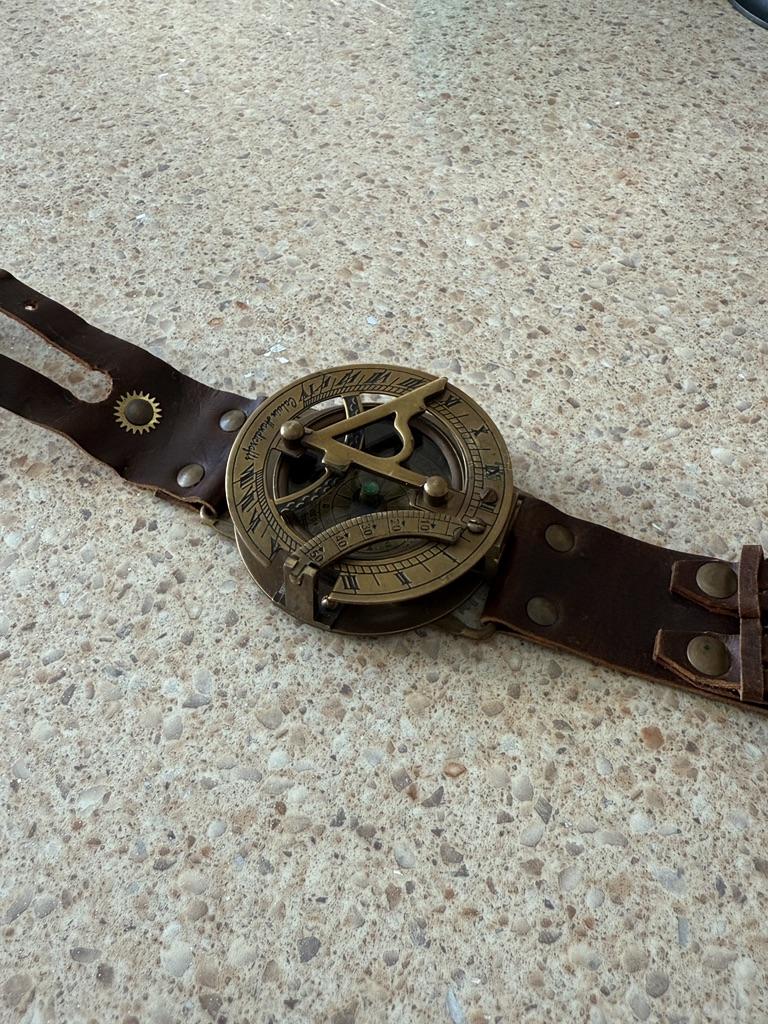 Reloj de pulsera Steampunk con brújula y reloj de sol con pulsera de cuero Latón y cuero Dimensiones Brújula Reloj de sol 6,35 cm. Un maravilloso regalo para los entusiastas del mar, la náutica, el senderismo y las actividades al aire libre.. La brújula y el reloj de sol son funcionales.. Es adecuado para mediciones básicas.. Tanto la brújula como el reloj de sol son funcionales.