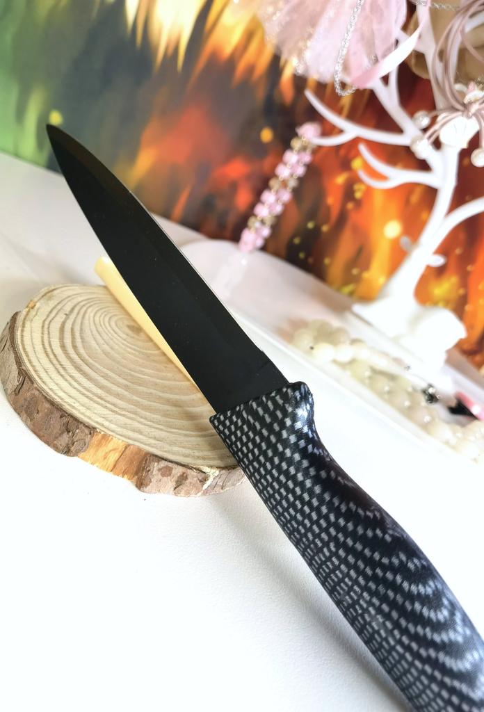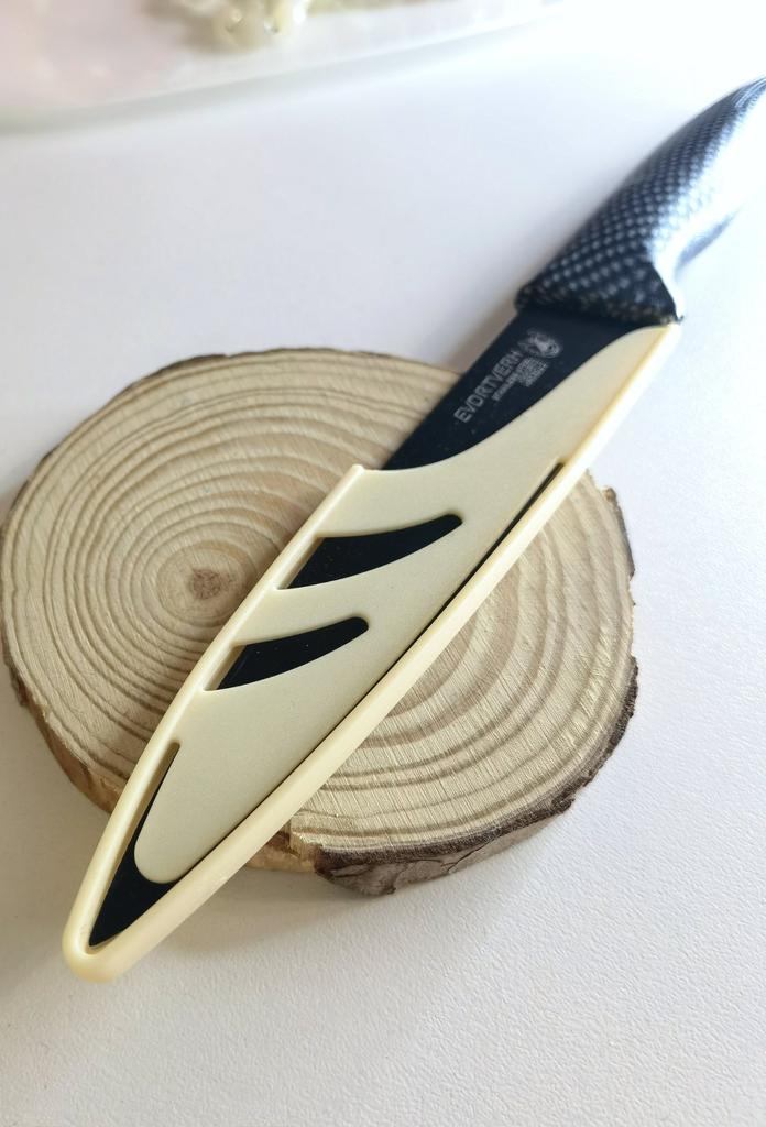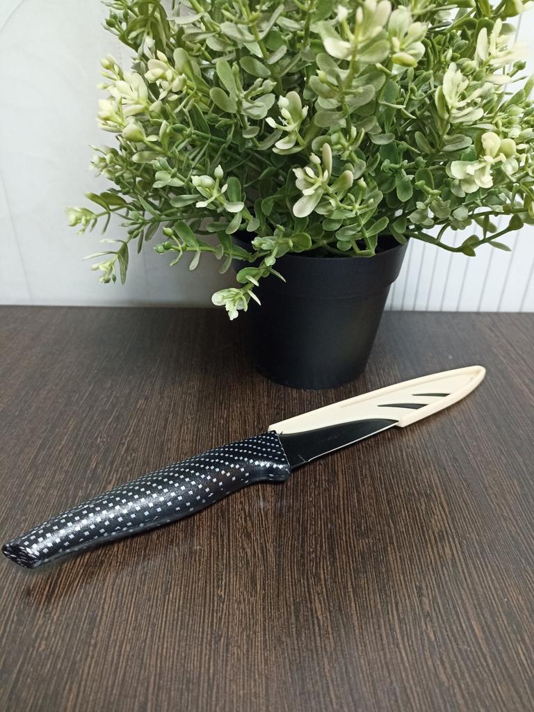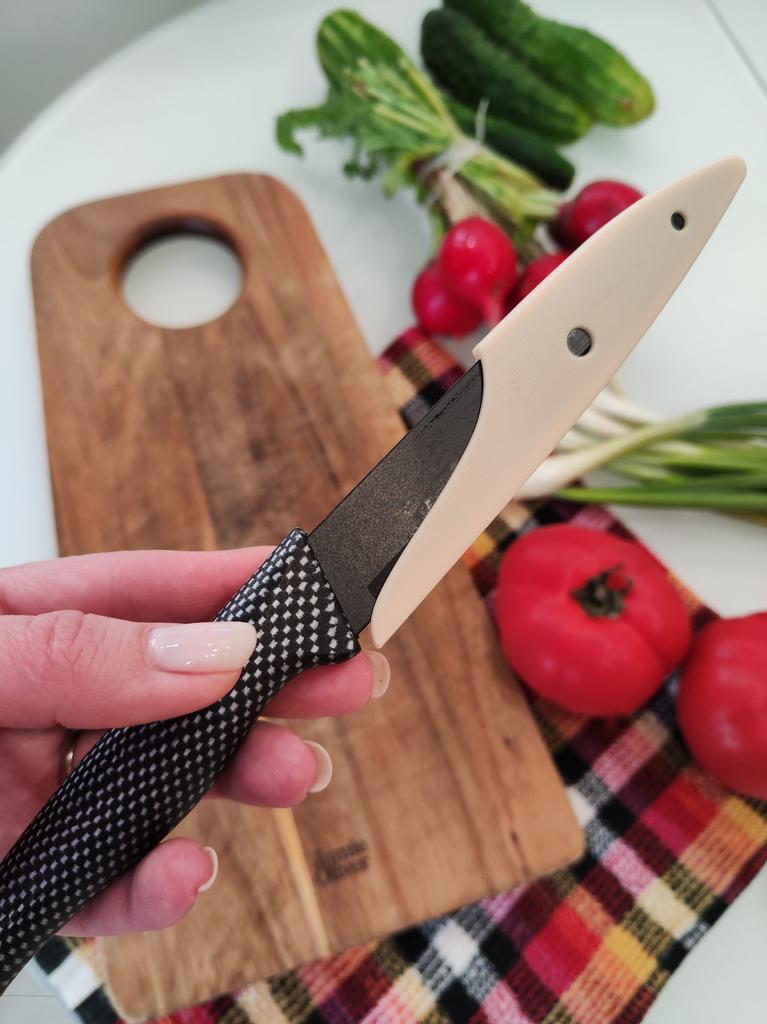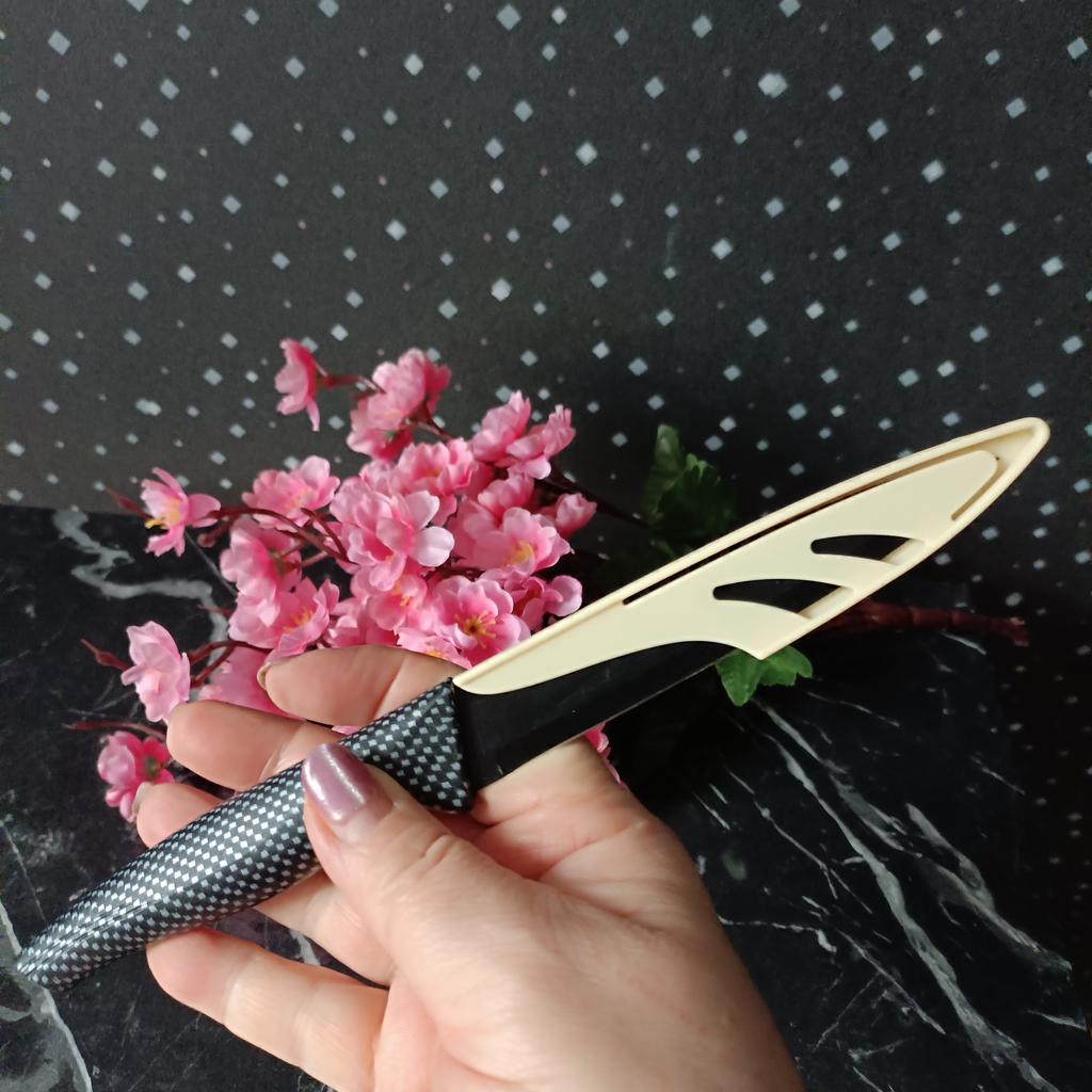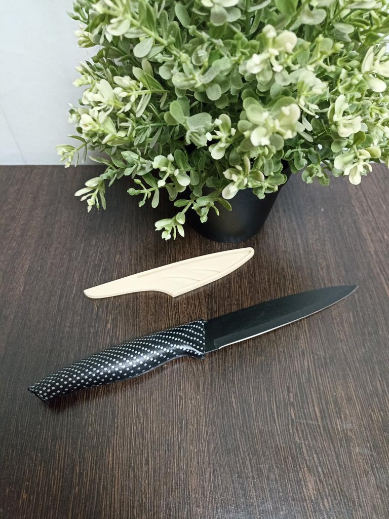 Cuchillo de fruta económico. Lindo, con un mango de lunares 🤗 Bueno, no exactamente lunares, si lo miras más de cerca son cuadrados, pero se ve lindo.. El mango es de plástico, la hoja es de acero inoxidable y negra 👍 En un lado hay una inscripción con el nombre de la marca, escudo, grado del acero y una indicación de que es acero inoxidable.. El cuchillo cabe cómodamente en la mano.. Otra característica muy interesante es la portada. Es de plástico, con ranuras, cubre de forma segura la hoja y no se cae.