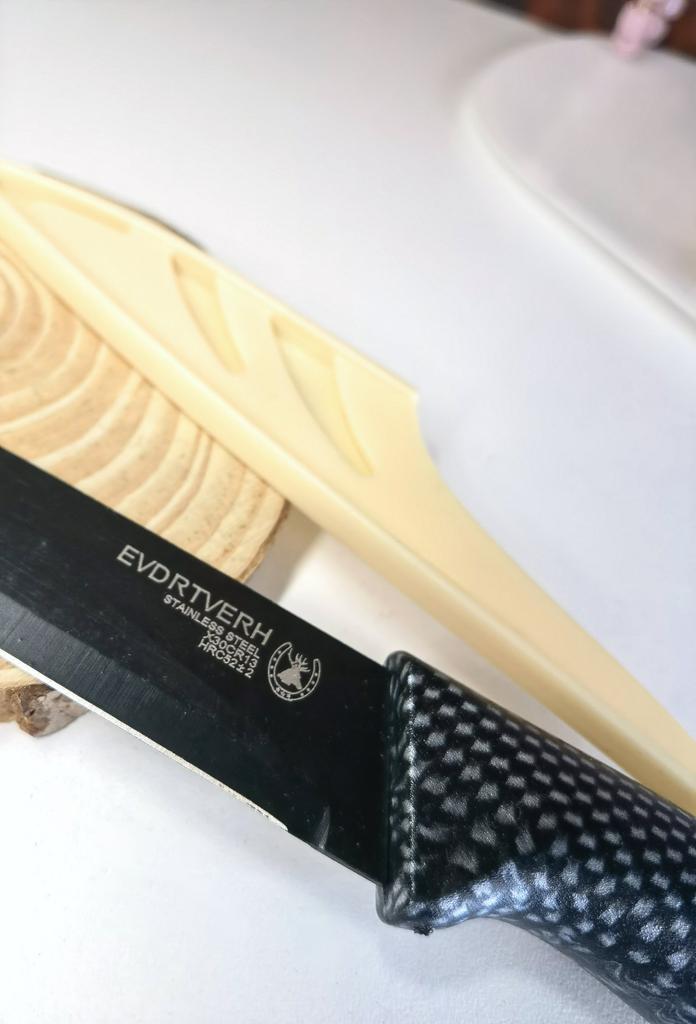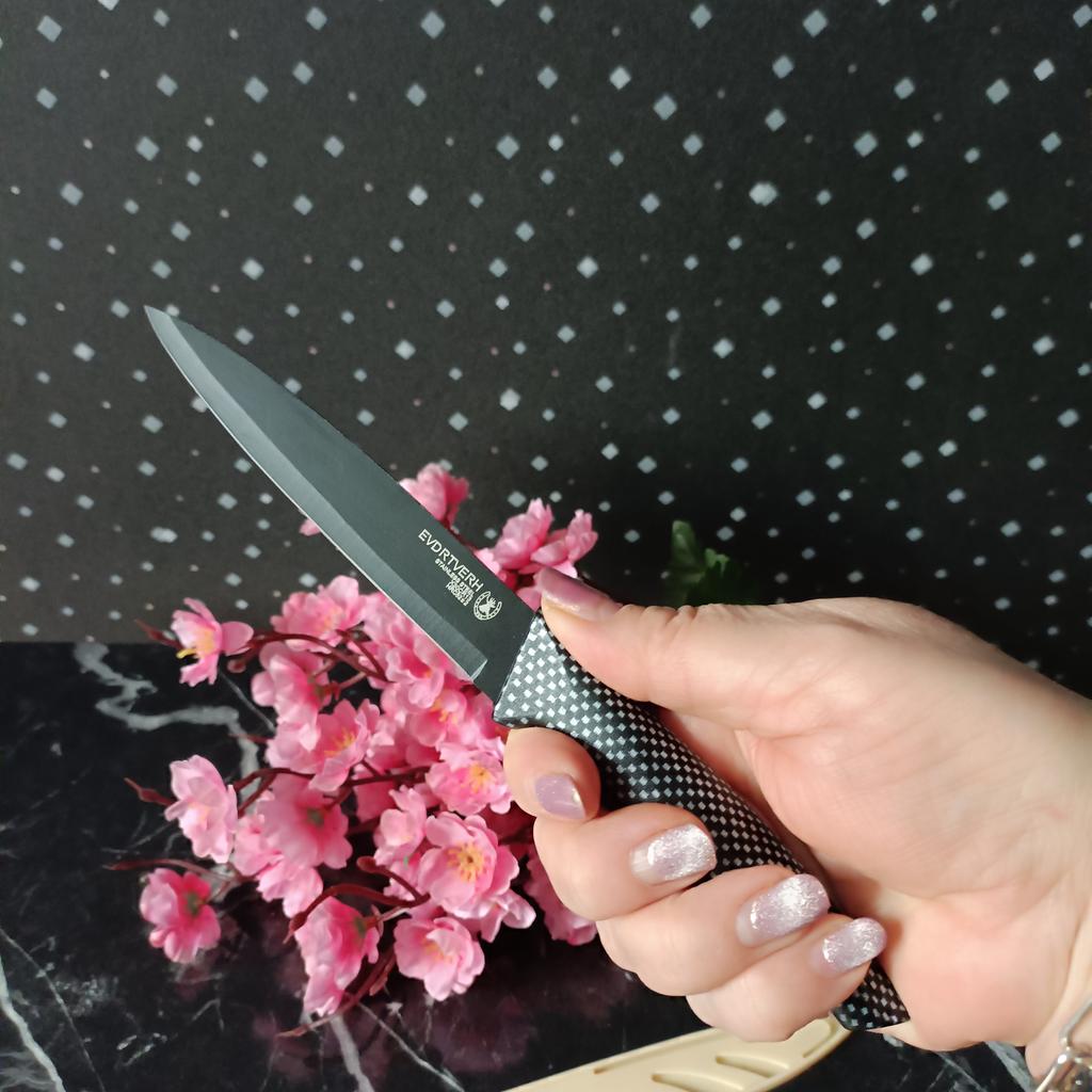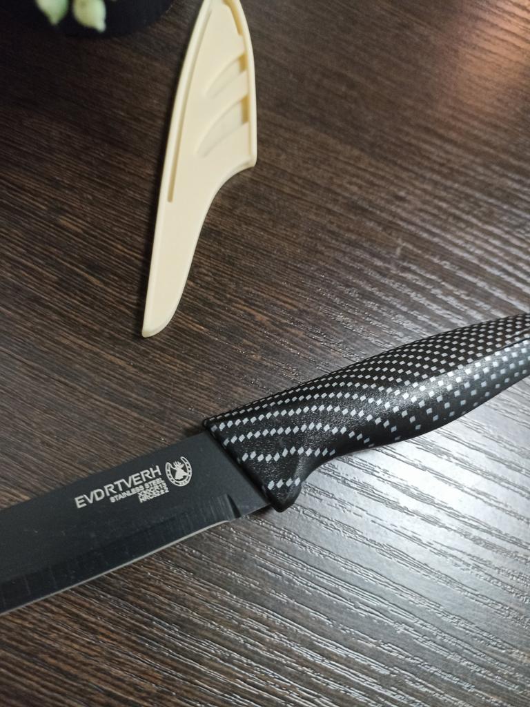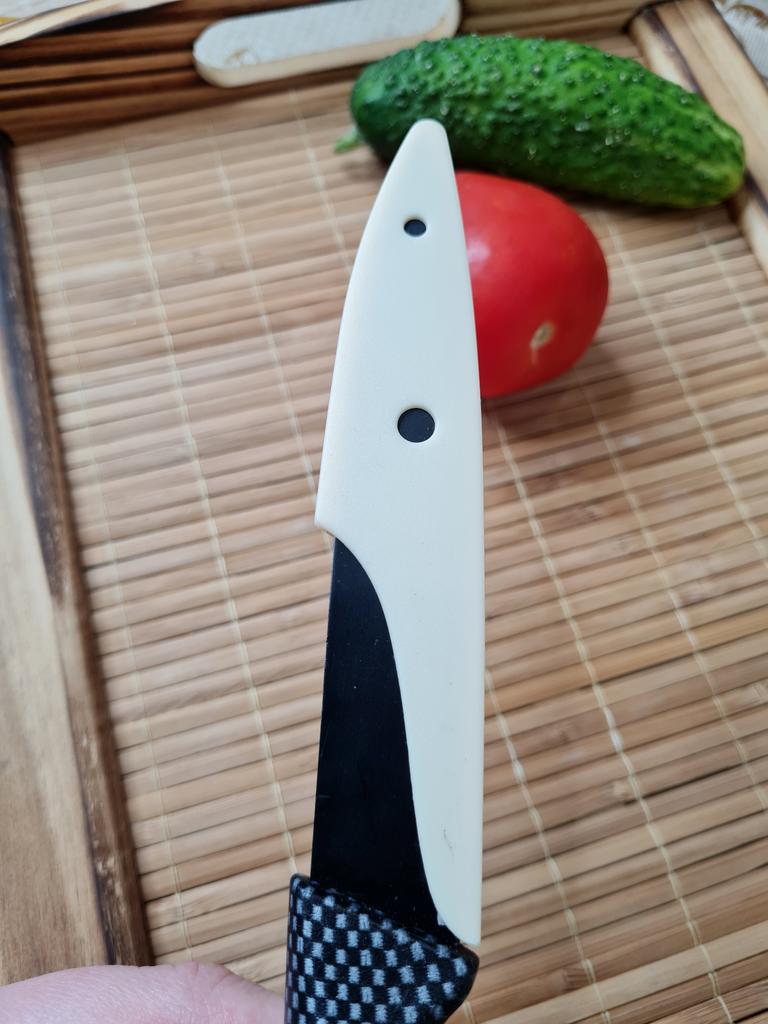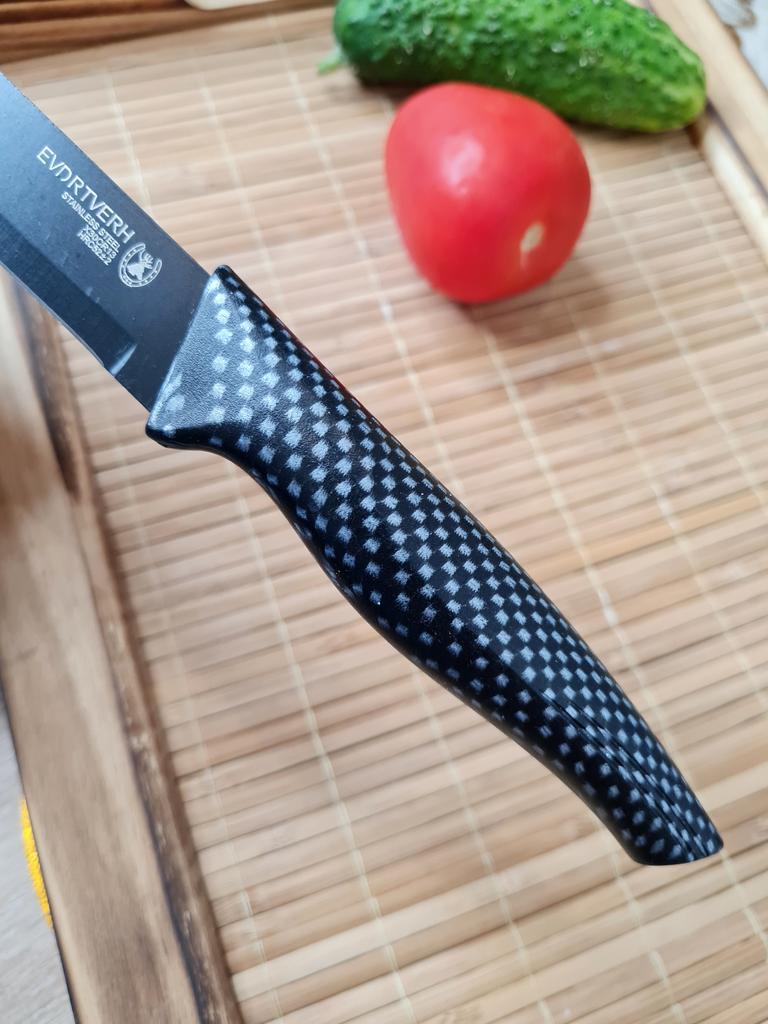Cuchillo de fruta económico. Lindo, con un mango de lunares 🤗 Bueno, no exactamente lunares, si lo miras más de cerca son cuadrados, pero se ve lindo.. El mango es de plástico, la hoja es de acero inoxidable y negra 👍 En un lado hay una inscripción con el nombre de la marca, escudo, grado del acero y una indicación de que es acero inoxidable.. El cuchillo cabe cómodamente en la mano.. Otra característica muy interesante es la portada. Es de plástico, con ranuras, cubre de forma segura la hoja y no se cae.