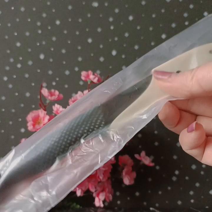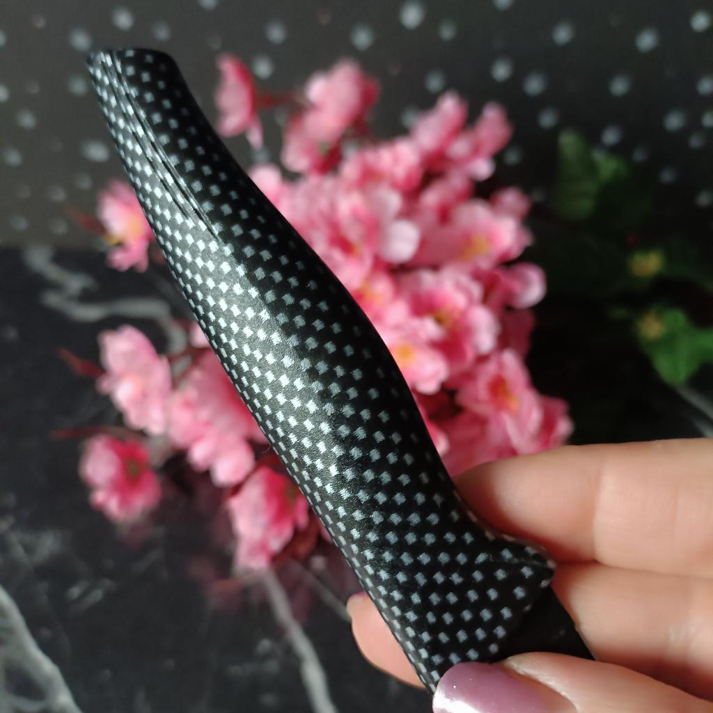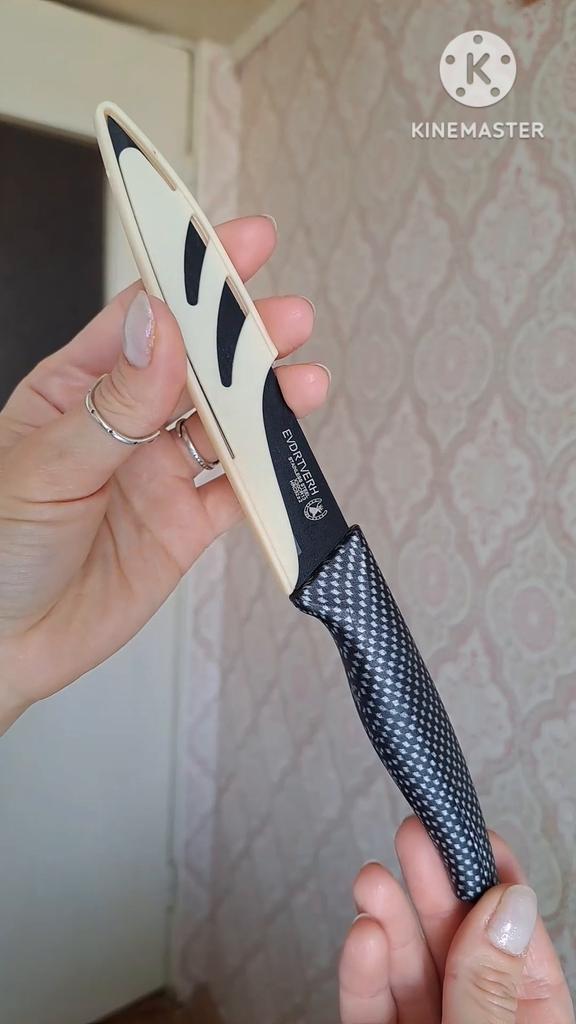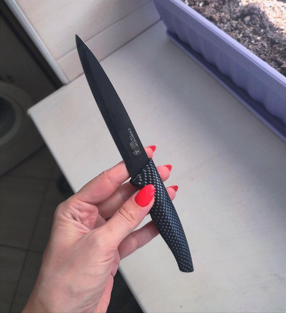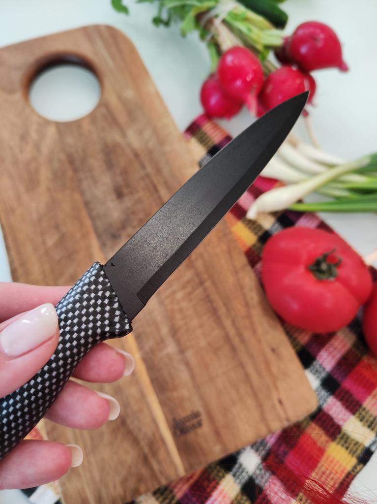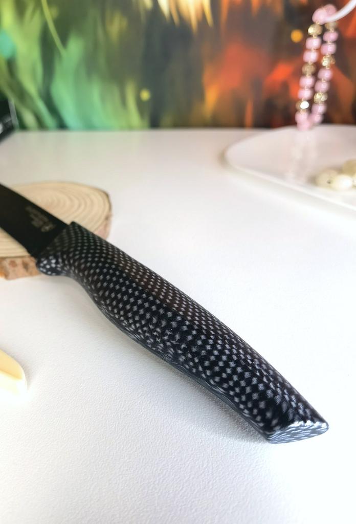Cuchillo de fruta económico. Lindo, con un mango de lunares 🤗 Bueno, no exactamente lunares, si lo miras más de cerca son cuadrados, pero se ve lindo.. El mango es de plástico, la hoja es de acero inoxidable y negra 👍 En un lado hay una inscripción con el nombre de la marca, escudo, grado del acero y una indicación de que es acero inoxidable.. El cuchillo cabe cómodamente en la mano.. Otra característica muy interesante es la portada. Es de plástico, con ranuras, cubre de forma segura la hoja y no se cae.