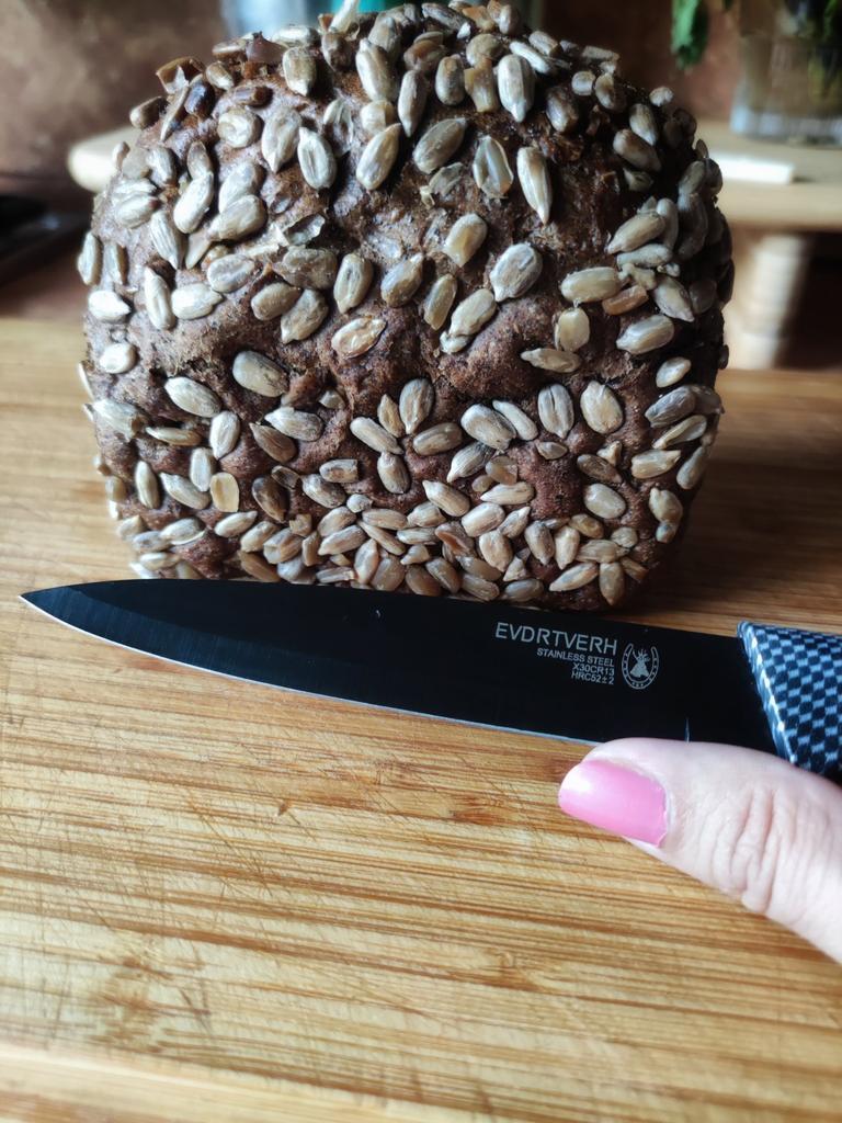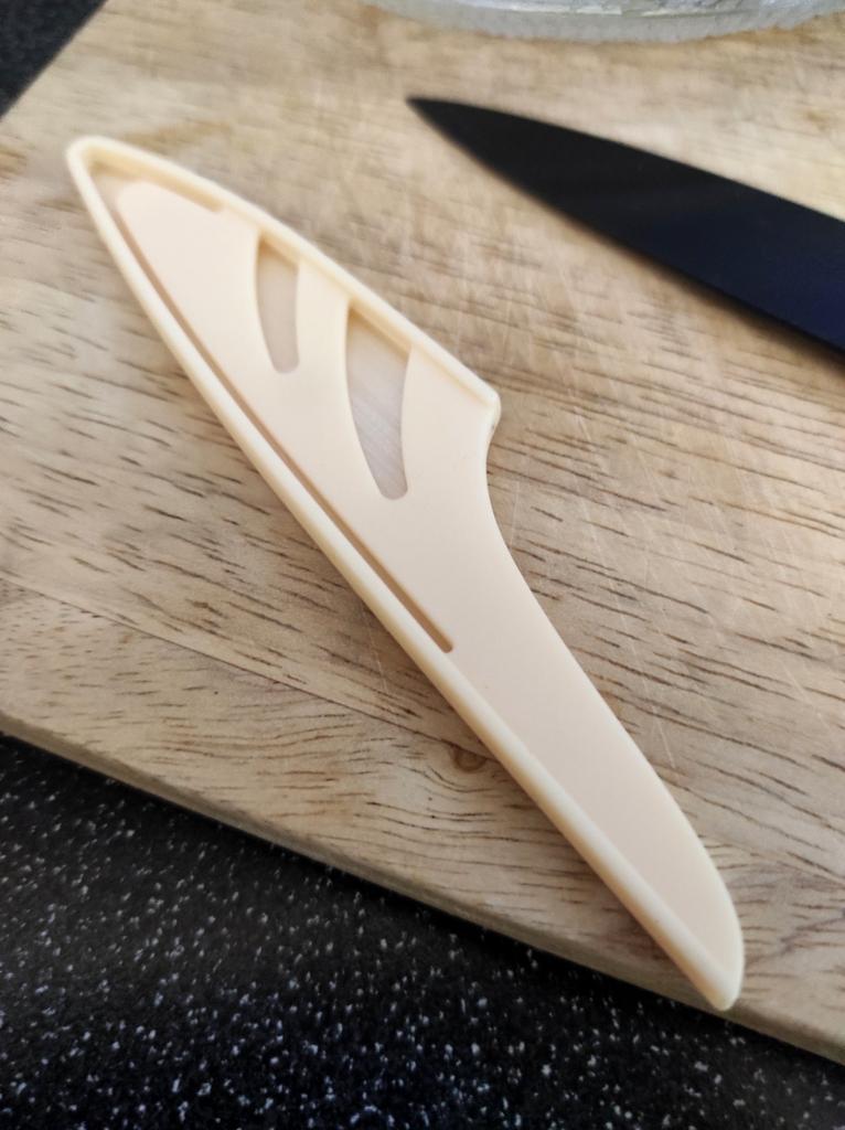 cuchillo genial Picante, ligero. Ideal para fruta y pan pequeño.. Corta limpiamente. Funda de plástico incluida.. No hubo problemas con él en la aduana, aunque los cuchillos suelen ralentizarse. Pero a este pequeño se le permite pasar sin problemas.. Aún no he probado a afilarlo porque, repito, el cuchillo está muy afilado.