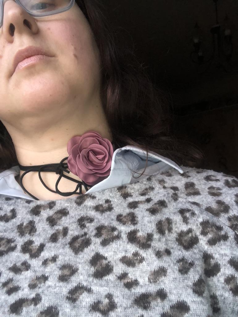La flor está un poco plana nada más sacarla del paquete, pero creo que no es tan evidente en el cuello.