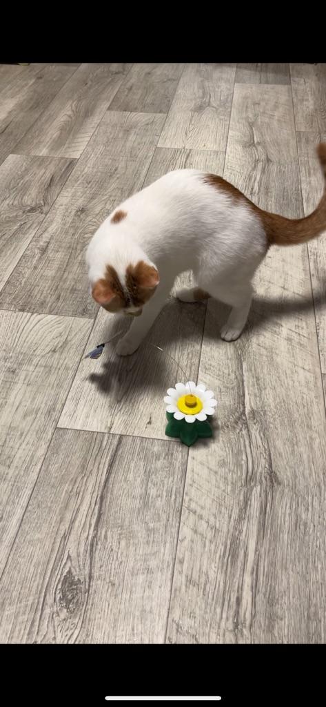 Un juguete chulo, al gato le gusta, pero la mariposa no está hecha de plumas.
