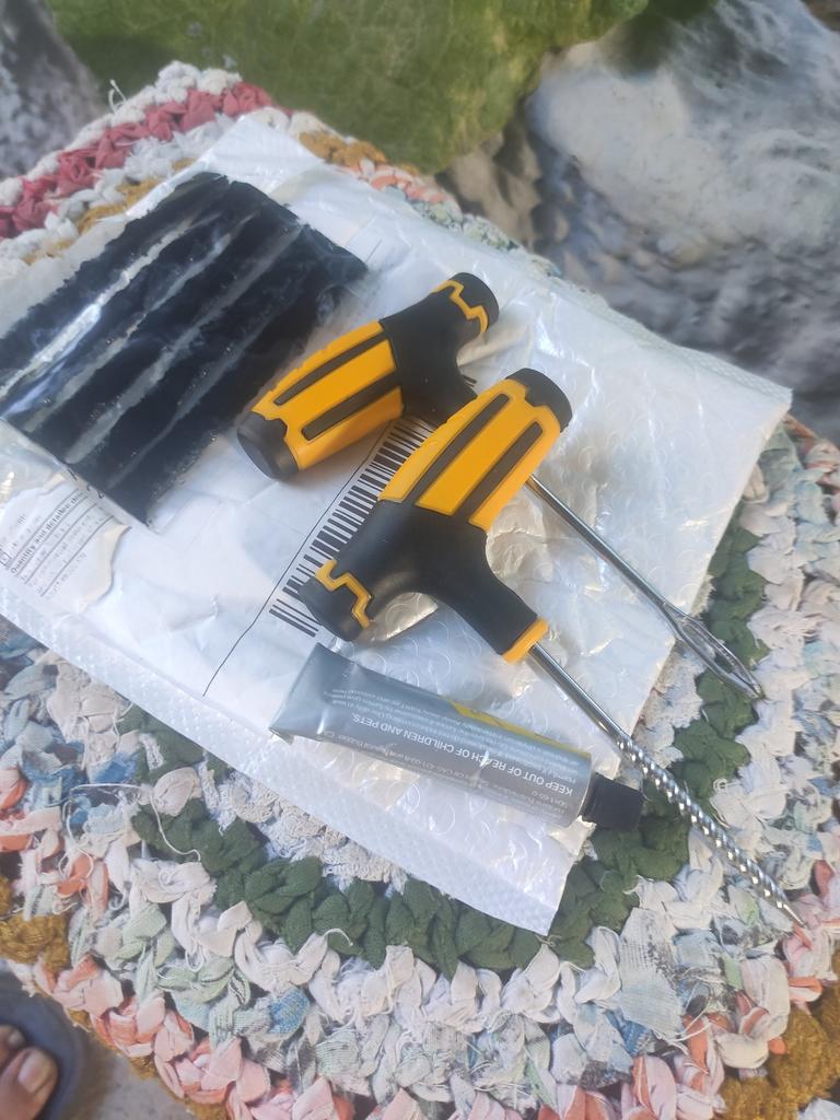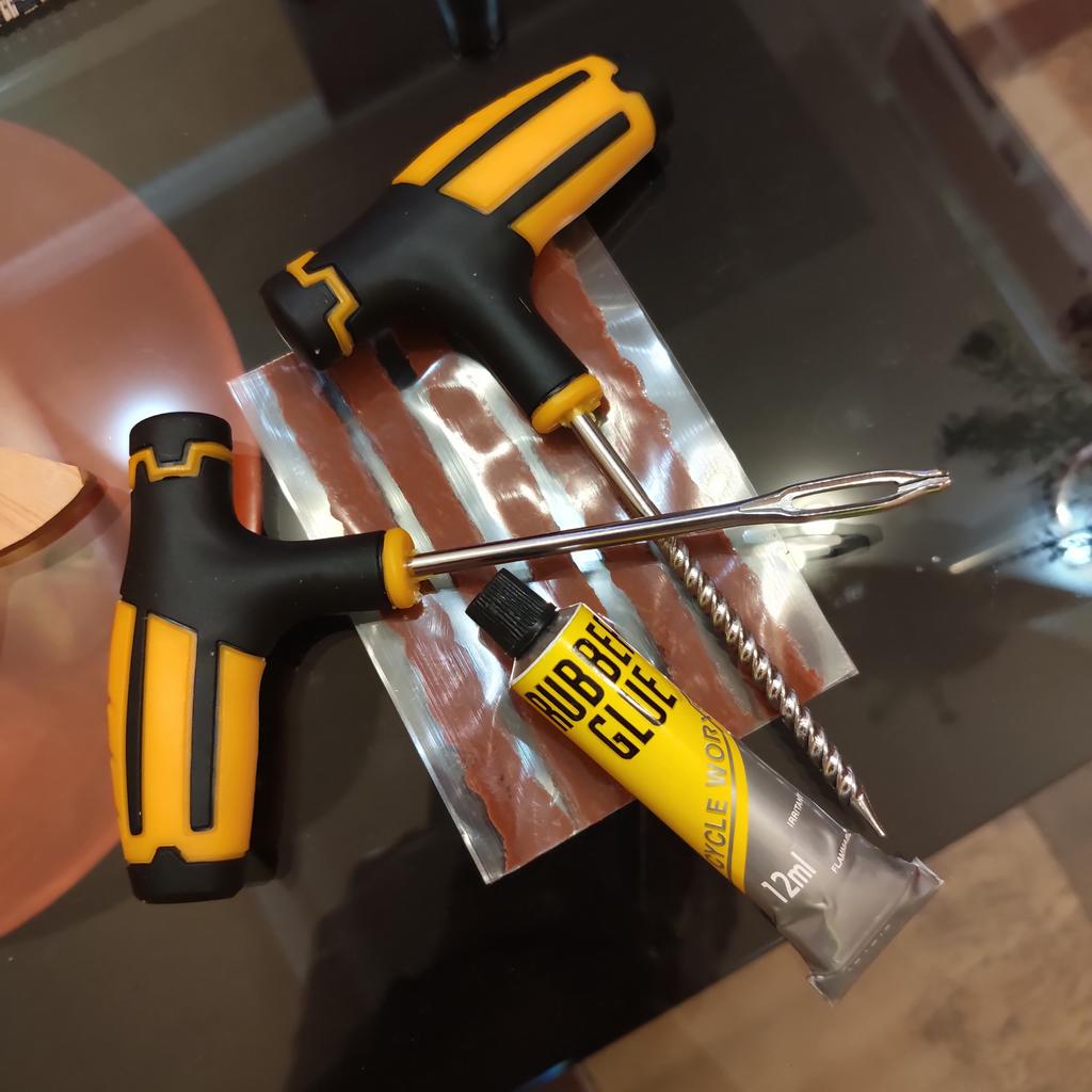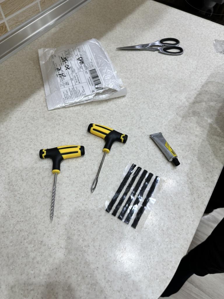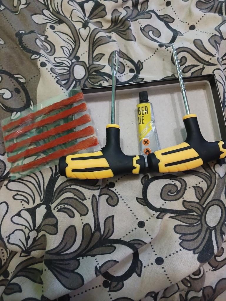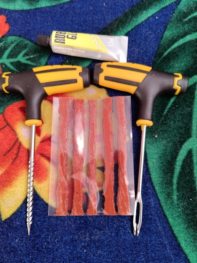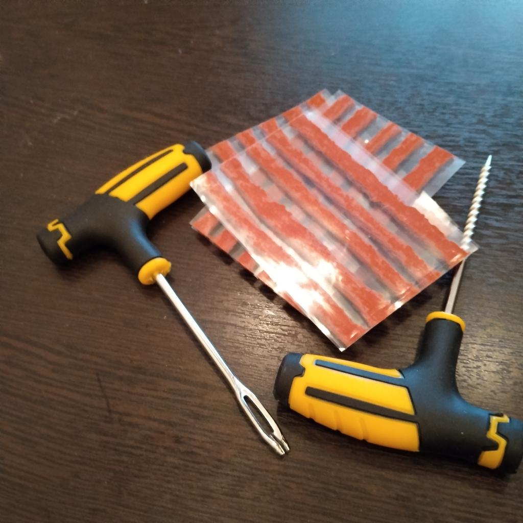 El kit de reparación de neumáticos corresponde a la descripción. Las asas están hechas de goma y plástico y son cómodas de sujetar.