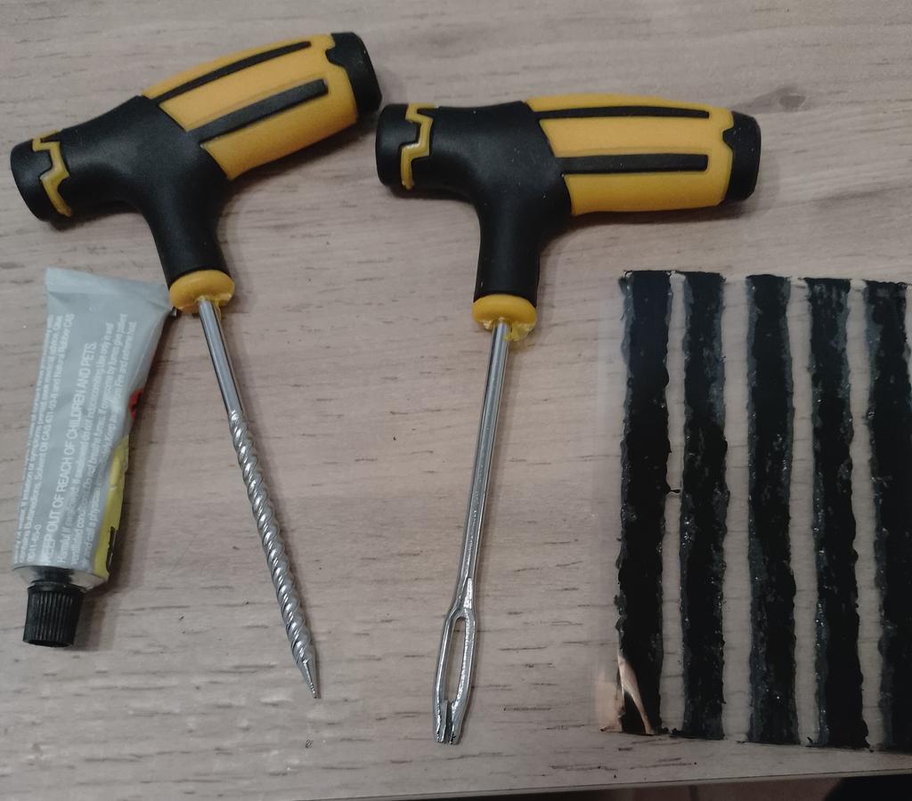 1 botella de pegamento para reparación de neumáticos, 5 tiras de reparación de neumáticos, 1 broca de tapón, 1 broca de rosca