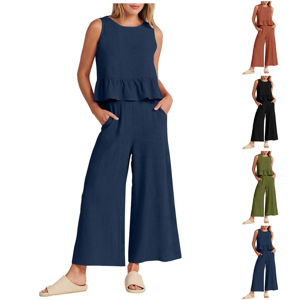 Lindo conjunto de verano de 2 piezas con un top recortado con cuello redondo sin mangas con volantes con botones en la espalda y pantalones elásticos de pierna ancha de gran altura con bolsillos encima.