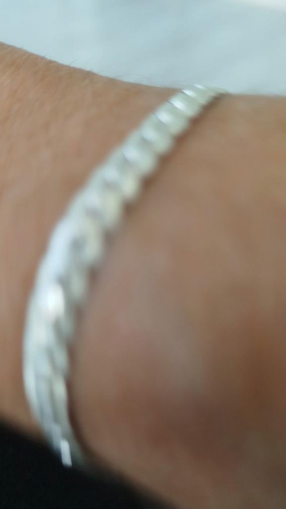 Buena pulsera, bonita. No estoy segura de si es plata, posiblemente sea alguna aleación con mezcla de plata. Pero así se ve bien en la mano.
