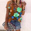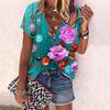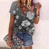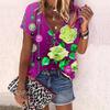Top de mujer de verano nuevo de moda con estampado de flores rosas y flores brillantes, informal, con cremallera, cuello en V, manga corta