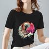 Ropa de mujer, camiseta, Tops, moda informal, dibujos animados, patrón de gato naranja japonés, estampado, camiseta negra ajustada con cuello redondo para ir al trabajo