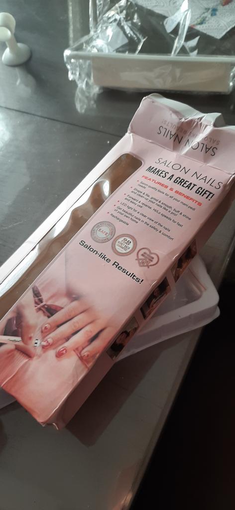 La caja está un poco arrugada, pero todo está intacto y parece funcionar. Parece algo genial para manicura casera.