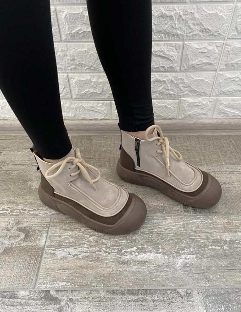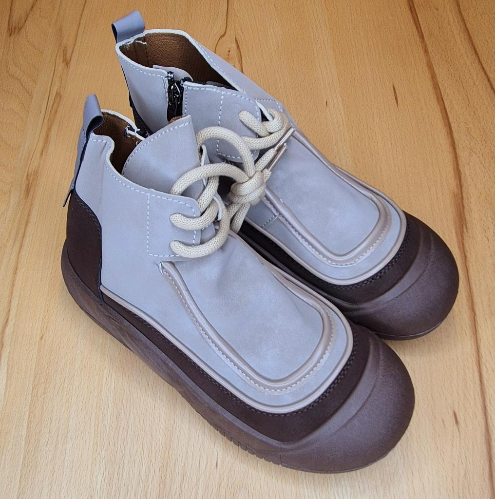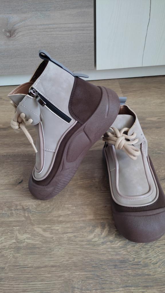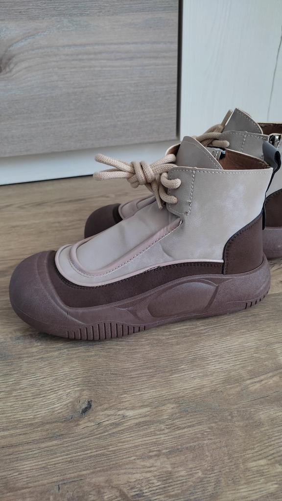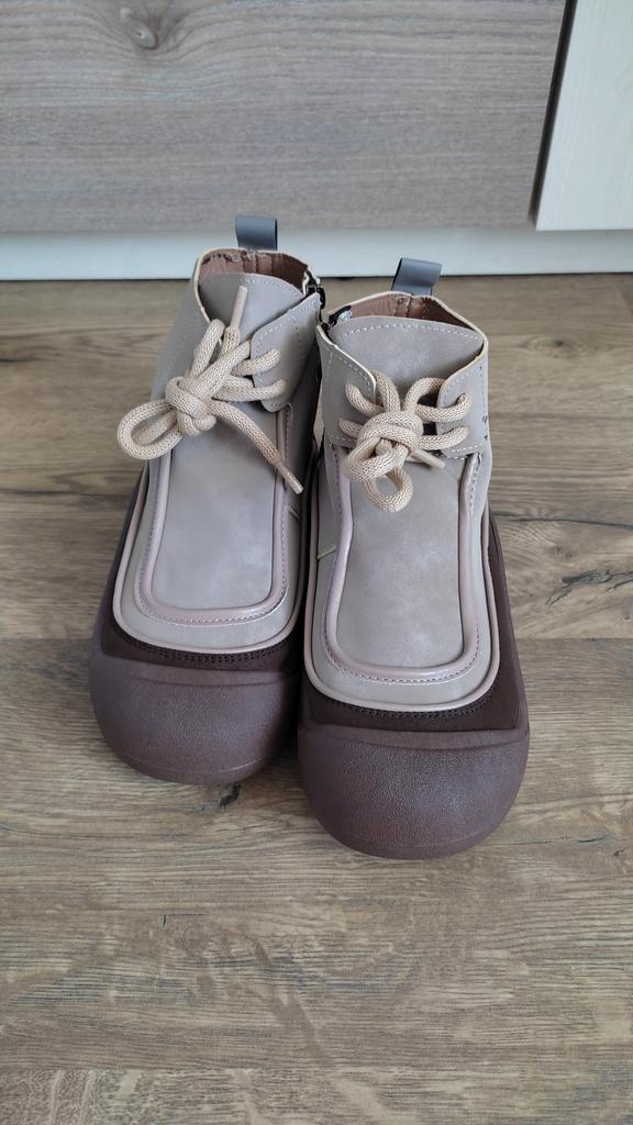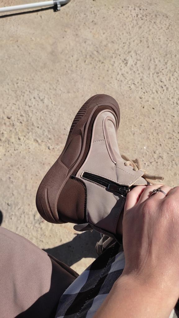 Zapatos con los que puedas caminar en tiempo húmedo.. Elegante y práctico . Diseñado para otoño y primavera.. Son agradables al tacto y los pies se sienten cómodos con ellos.. Recomiendo especialmente echar un vistazo más de cerca a estos zapatos para quienes tienen perros. Si el clima está húmedo, estos son excelentes zapatos porque tus pies estarán secos.. Tomé la talla 36 para mi 36. Si tienes el pie ancho, lo más probable es que te cueste entrar en la pierna.. Hay un cordón, pero no se estira mucho.. Se atan a una serpiente en el costado.. La calidad es excelente ♥️ Me gustó el diseño, inusual 👍
