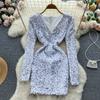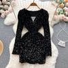 Vestido de una pieza con lentejuelas para mujer, vestido Sexy de manga larga con cuello en V, moda coreana, vestido de fiesta de noche Vintage 2024
