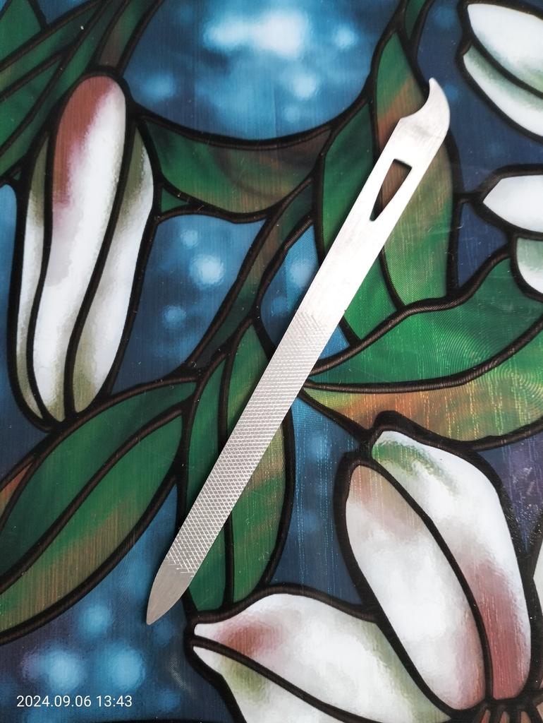 Esta lima es completamente metálica. Las puntas son afiladas. Me gusta que tenga un agujero, pero la lima es rígida. Muy satisfecha con la lima.