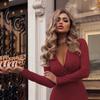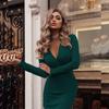 Women Fashion Long Sleeve Deep V-Neck Pleated Solid Color Plus Size Package Hip Party Mini Dress